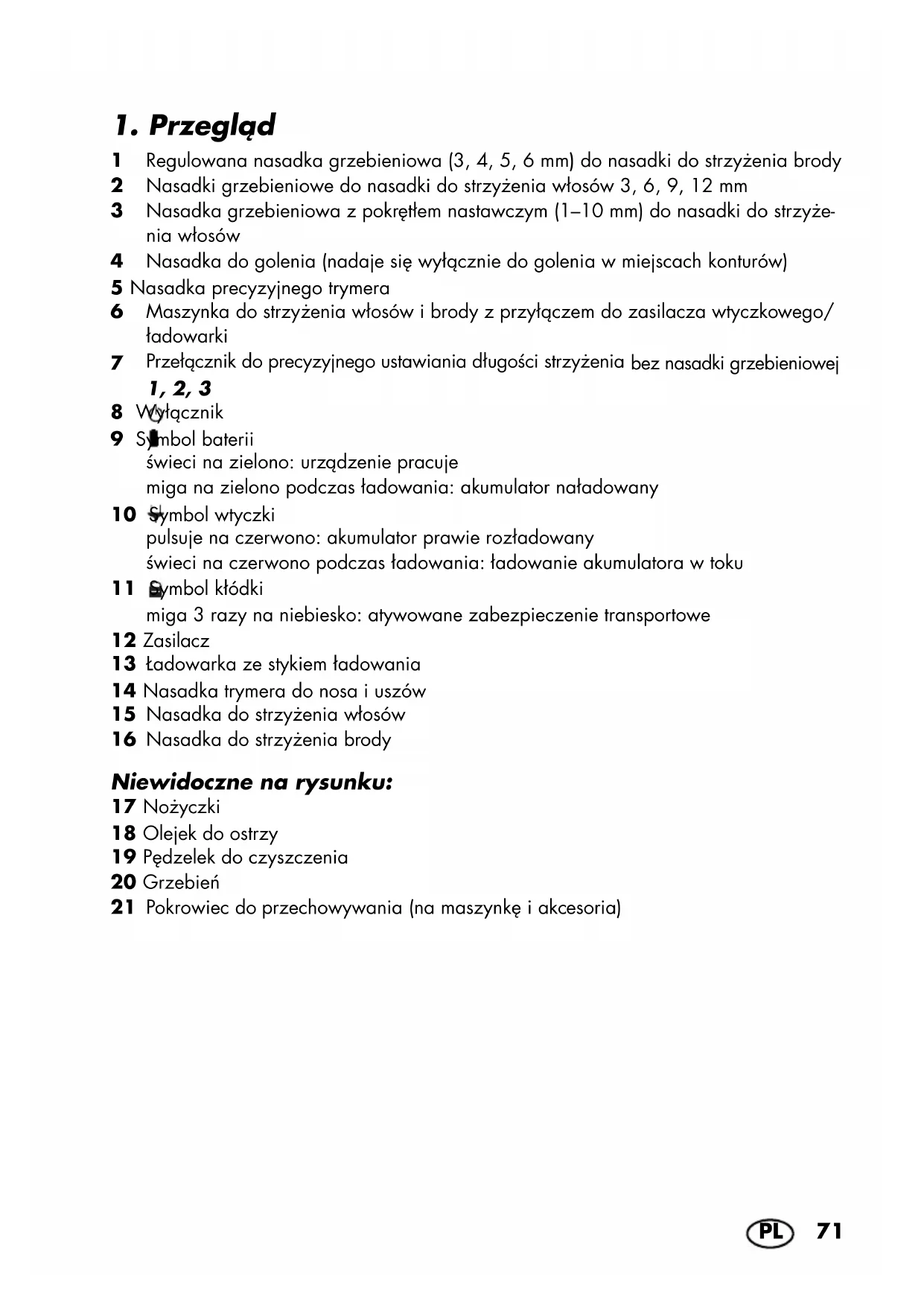 Przełącznik do precyzyjnego ustawiania długości strzyżenia bez nasadki grzebieniowej 1, 2, 3 8 Wyłącznik 9 Symbol baterii świeci na zielono: urządzenie pracuje miga na zielono podczas ładowania: akumulator naładowany 10 Symbol wtyczki pulsuje na czerwono: akumulator prawie rozładowany świeci na czerwono podczas ładowania: ładowanie akumulatora w toku 11 Symbol kłódki miga 3 razy na niebiesko: atywowane zabezpieczenie transportowe 12 Zasilacz 13 Ładowarka ze stykiem ładowania 14 Nasadka trymera do nosa i uszów 15 Nasadka do strzyżenia włosów 16 Nasadka do strzyżenia brody Niewidoczne na rysunku: 17 Nożyczki 18 Olejek do ostrzy 19 Pędzelek do czyszczenia 20 Grzebień 21 Pokrowiec do przechowywania (na maszynkę i akcesoria) __384419_2107_B8.book Seite 71 Mittwoch, 17. November 2021 11:35 1172