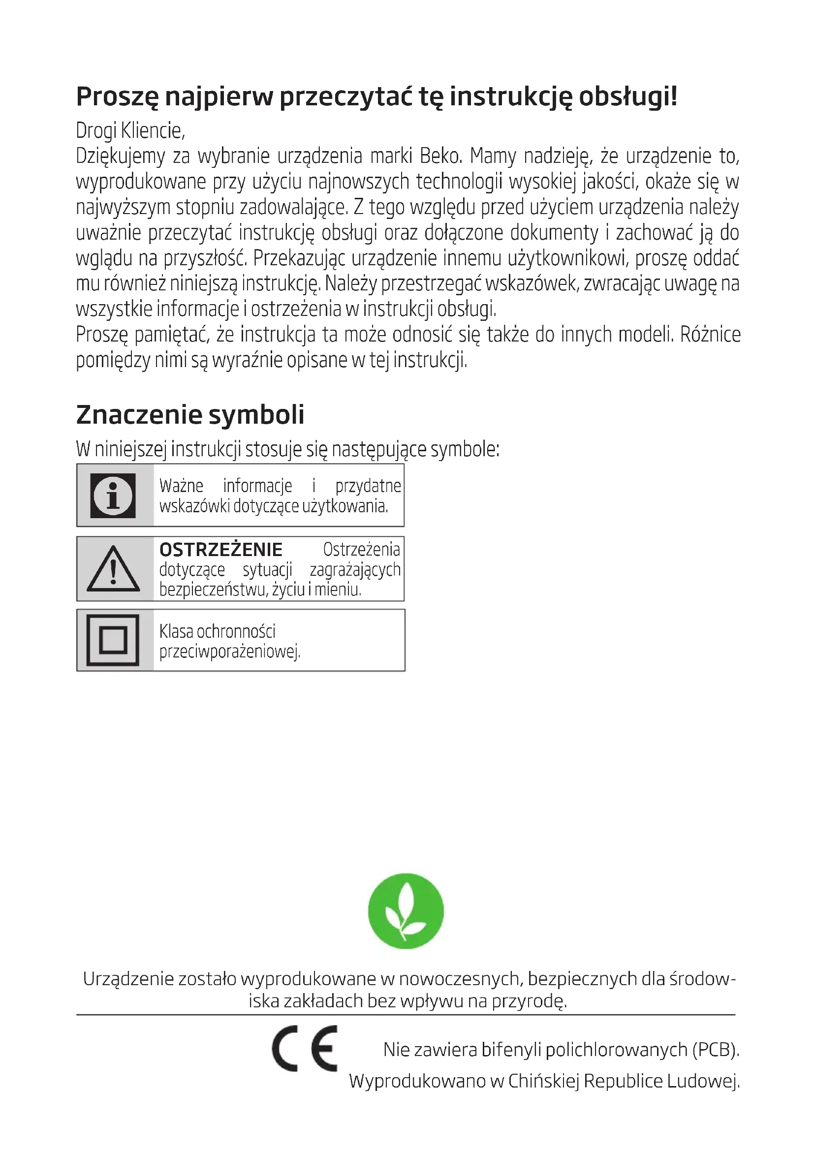 Prima di contattare l’assistenza tecnica, al ne di agevolare la gestione della chiamata, è necessario avere a portata di mano il modello del prodotto e il documento scale di acquisto.Proszę najpierw przeczytać tę instrukcję obsługi! Drogi Kliencie, Dziękujemy za wybranie urządzenia marki Beko. Mamy nadzieję, że urządzenie to, wyprodukowane przy użyciu najnowszych technologii wysokiej jakości, okaże się w najwyższym stopniu zadowalające. Z tego względu przed użyciem urządzenia należy uważnie przeczytać instrukcję obsługi oraz dołączone dokumenty i zachować ją do wglądu na przyszłość. Przekazując urządzenie innemu użytkownikowi, proszę oddać mu również niniejszą instrukcję. Należy przestrzegać wskazówek, zwracając uwagę na wszystkie informacje i ostrzeżenia w instrukcji obsługi. Proszę pamiętać, że instrukcja ta może odnosić się także do innych modeli. Różnice pomiędzy nimi są wyraźnie opisane w tej instrukcji. Znaczenie symboli W niniejszej instrukcji stosuje się następujące symbole: