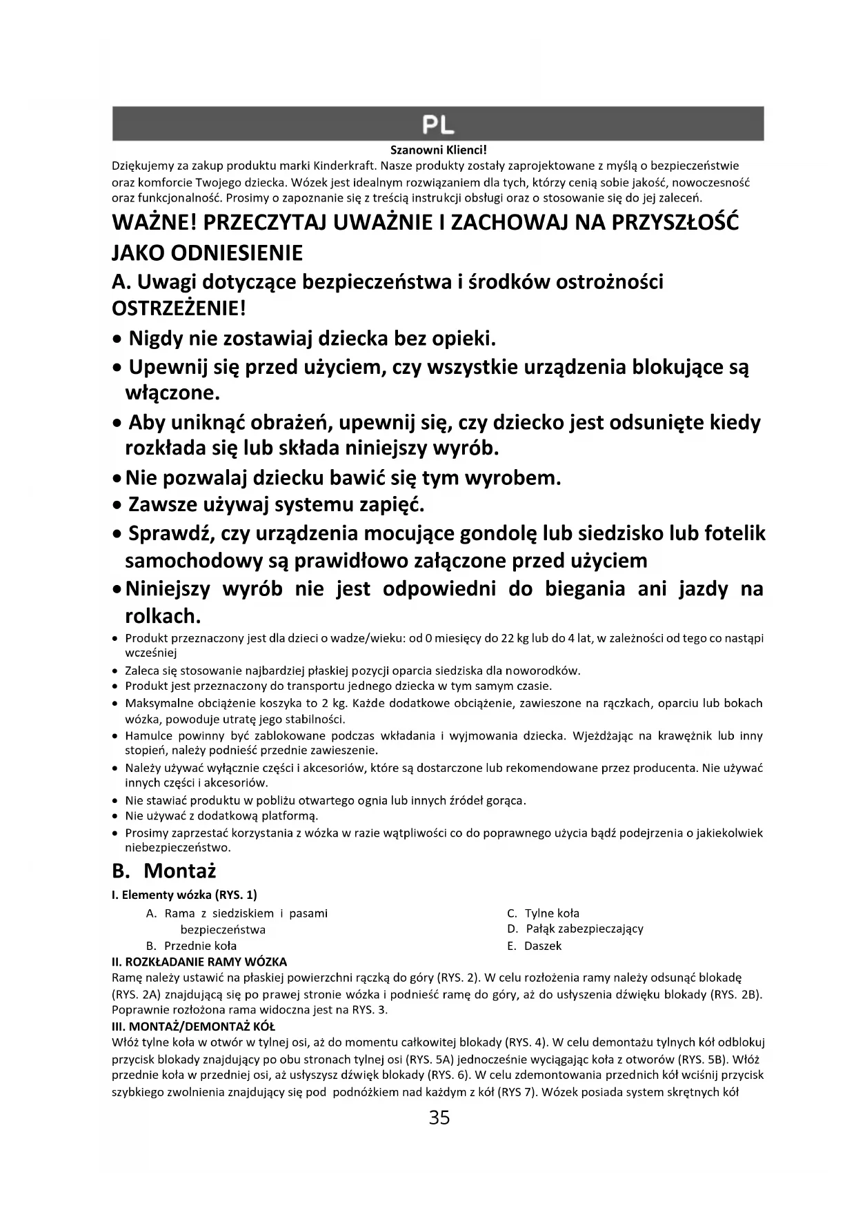 Szanowni Klienci! Dziękujemy za zakup produktu marki Kinderkraft. Nasze produkty zostały zaprojektowane z myślą o bezpieczeństwie oraz komforcie Twojego dziecka. Wózek jest idealnym rozwiązaniem dla tych, którzy cenią sobie jakość, nowoczesność oraz funkcjonalność. Prosimy o zapoznanie się z treścią instrukcji obsługi oraz o stosowanie się do jej zaleceń. WAŻNE! PRZECZYTAJ UWAŻNIE I ZACHOWAJ NA PRZYSZŁOŚĆ JAKO ODNIESIENIE A. Uwagi dotyczące bezpieczeństwa i środków ostrożności OSTRZEŻENIE!