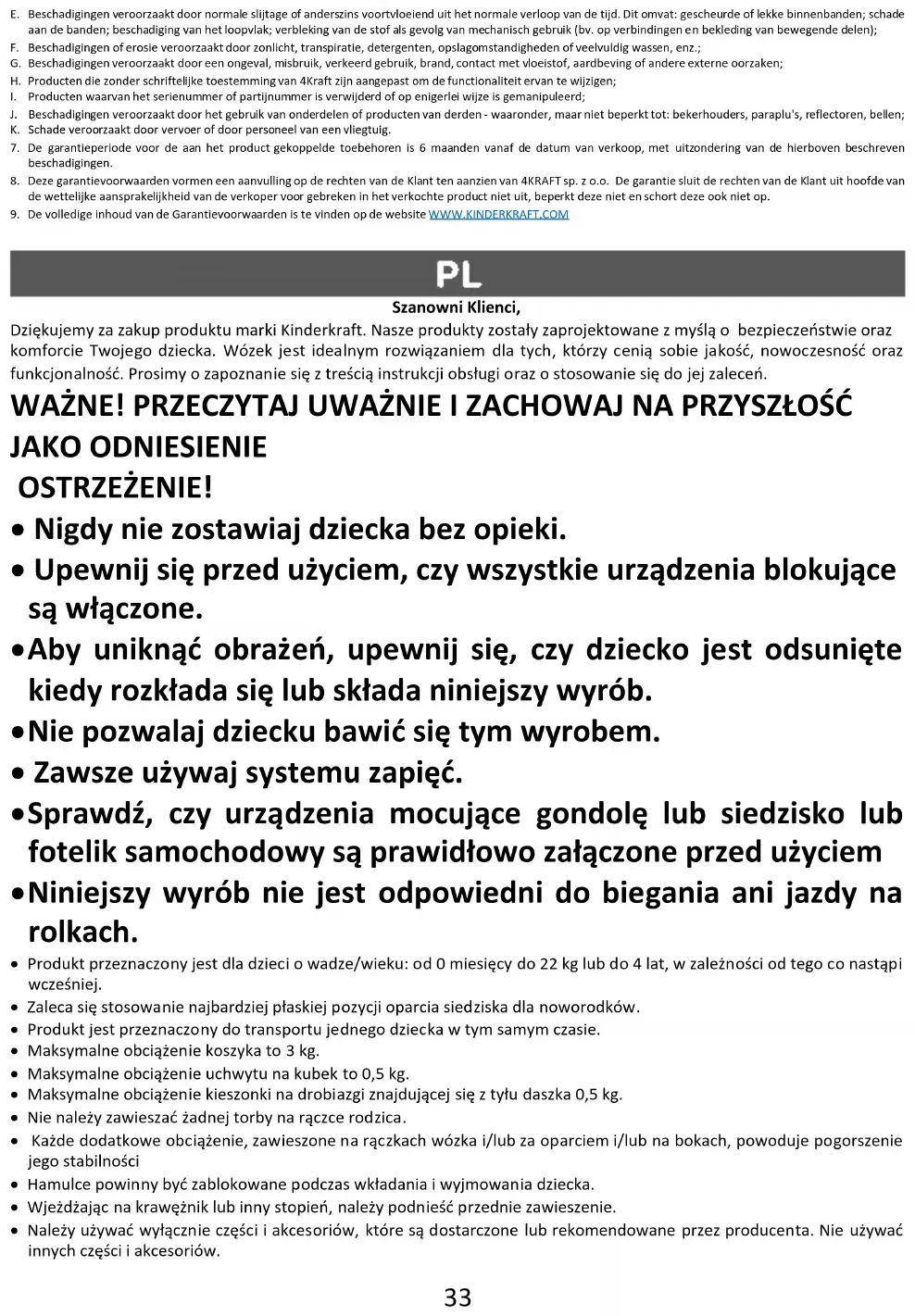 Szanowni Klienci, Dziękujemy za zakup produktu marki Kinderkraft. Nasze produkty zostały zaprojektowane z myślą o bezpieczeństwie oraz komforcie Twojego dziecka. Wózek jest idealnym rozwiązaniem dla tych, którzy cenią sobie jakość, nowoczesność oraz funkcjonalność. Prosimy o zapoznanie się z treścią instrukcji obsługi oraz o stosowanie się do jej zaleceń. WAŻNE! PRZECZYTAJ UWAŻNIE I ZACHOWAJ NA PRZYSZŁOŚĆ JAKO ODNIESIENIE OSTRZEŻENIE!