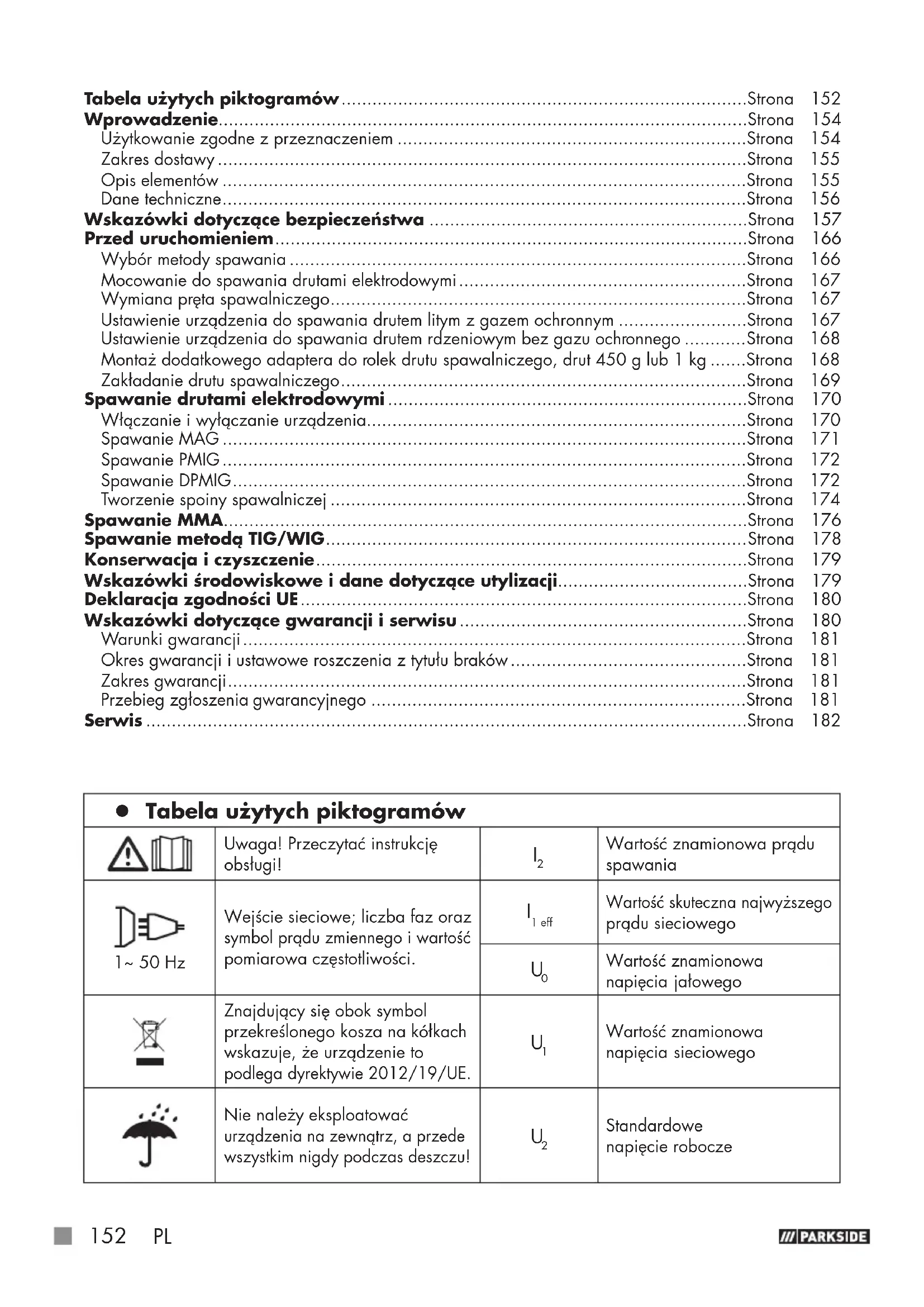 Spawarka wielofunkcyjna z technologią Doppelpuls PMPS 200 B1 z Wprowadzenie Gratulacje! Zdecydowali się Państwo na zakup wysokiej jakości produktu naszej firmy. Rekomendujemy zapoznanie się zproduktem przed pierwszym użyciem. Wtym celu należy uważnie przeczytać niniejszą instrukcję obsługi iwskazówki dotyczące bezpieczeństwa. Z tego narzędzia mogą korzystać wyłącznie odpowiednio przeszkolone osoby. PRZECHOWYWAĆ POZA ZASIĘGIEM DZIECI! z Użytkowanie zgodne z przeznaczeniem Urządzenie jest przeznaczone do spawania drutem litym (MIG i MAG), spawania MMA (spawanie elektrodami otulonymi), spawania TIG (spawanie elektrodami wolframowymi w osłonie gazu obojętnego) oraz spawania drutem rdzeniowym. Przy używaniu drutów litych bez gazu ochronnego w formie stałej należy zastosować dodatkowo gaz ochronny. Przy spawaniu drutem rdzeniowym wytwarzającym własną atmosferę ochronną nie jest wymagane stosowanie dodatkowego gazu. W tym przypadku gaz ochronny jest zawarty w formie proszku w drucie spawalniczym i jest w ten sposób wprowadzany bezpośrednio do łuku. Dzięki temu urządzenie podczas pracy na zewnątrz jest niewrażliwe na wiatr. Dopuszczalne jest stosowanie wyłącznie drutów elektrodowych przystosowanych do tego urządzenia. To urządzenie spawalnicze nadaje się do ręcznego spawania łukowego (MMA) stali, stali nierdzewnej, blachy stalowej i żeliwa za pomocą odpowiednich elektrod osłonowych. Należy stosować się przy tym do zaleceń producenta elektrod. Dopuszczalne jest stosowanie wyłącznie elektrod przystosowanych do tego urządzenia. Przy spawaniu elektrodą wolframową w osłonie gazów obojętnych (TIG) oprócz zaleceń zawartych w niniejszej instrukcji należy bezwzględnie stosować się także do wskazówek dotyczących eksploatacji i bezpieczeństwa używanego palnika TIG. Niewłaściwa obsługa produktu może być niebezpieczna dla osób, zwierząt i mienia. Produktu należy używać wyłącznie wopisany sposób ido podanych zastosowań. Starannie przechowywać niniejszą instrukcję obsługi. W przypadku przekazania produktu osobom trzecim należy przekazać im również całą dokumentację. Wszelkie zastosowania różne od użytkowania zgodnego zprzeznaczeniem są zabronione ipotencjalnie niebez- pieczne. Szkody spowodowane nieprzestrzeganiem instrukcji lub użyciem niezgodnym z przeznaczeniem nie są objęte gwarancją inie należą do zakresu odpowiedzialności producenta. W przypadku użytku komercyjnego gwarancja wygasa. Użytkowanie zgodne z przeznaczeniem to również przestrzeganie wskazówek dotyczących bezpieczeństwa oraz instrukcji montażu i wskazówek eksploatacyjnych zamieszczonych w instrukcji obsługi. Należy dokładnie przestrzegać obowiązujących przepisów zapobiegania wypadkom. Urządzenia nie wolno stosować: w niedostatecznie przewietrzonych pomieszczeniach; w środowisku zagrożonym wybuchem; do odmrażania rur; w pobliżu osób z rozrusznikami serca; w pobliżu łatwopalnych materiałów. Ryzyko resztkowe Nawet wprzypadku obsługiwania urządzenia zgodnie zprzepisami występuje ryzyko resztkowe. Następujące niebezpieczeństwa mogą powstać w związku z konstrukcją i wykonaniem impulsowego urządzenia spawalniczego MIG: Urazy oczu spowodowane olśnieniem, dotknięciem gorących części urządzenia lub obrabianego przedmiotu (oparzenia); w razie niewłaściwego zabezpieczenia niebezpieczeństwo wypadku lub pożaru na skutek odskakujących iskier lub cząsteczek szlaki;PL