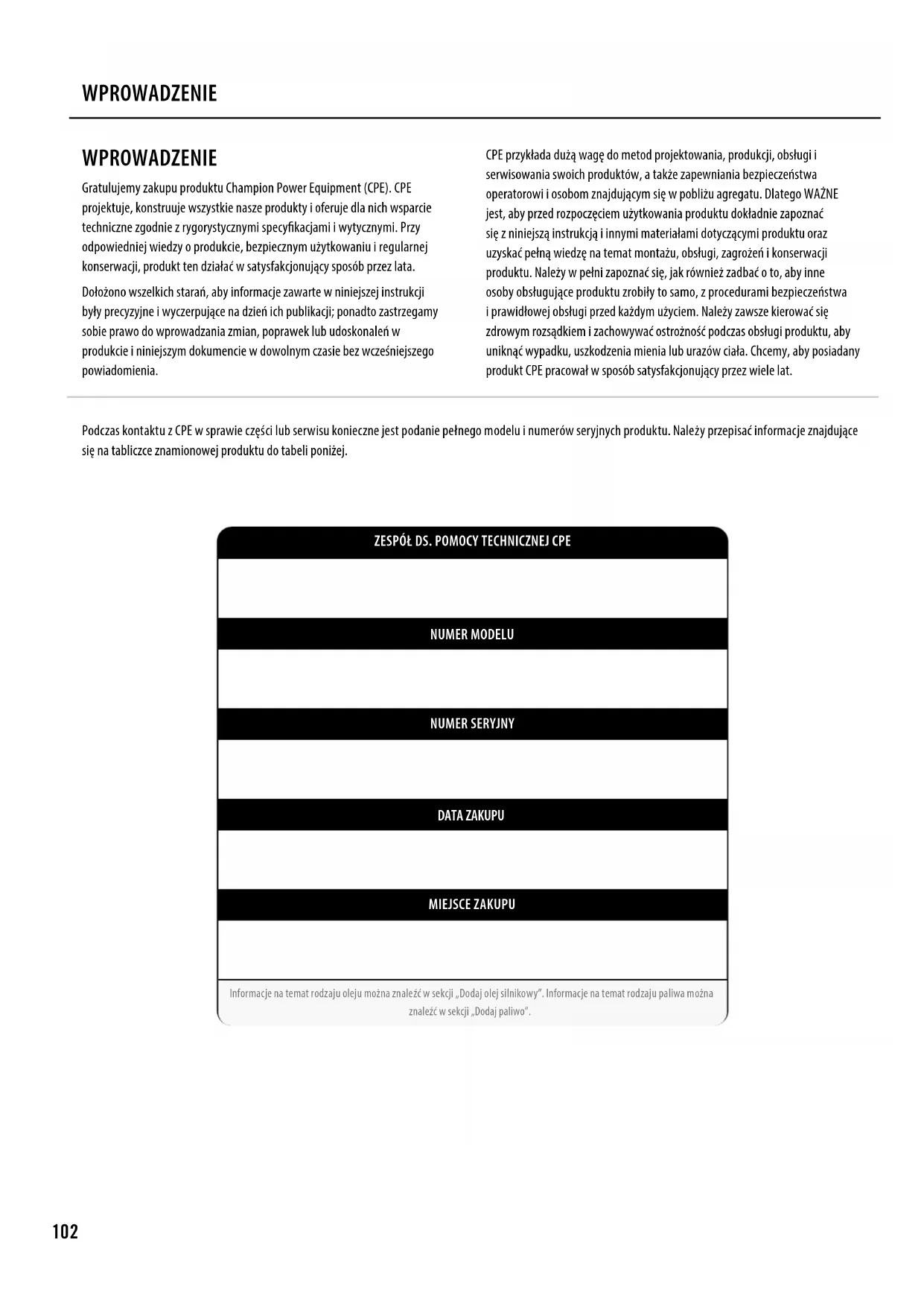 NUMER MODELU NUMER SERYJNY DATA ZAKUPU MIEJSCE ZAKUPU Informacje na temat rodzaju oleju można znaleźć w sekcji „Dodaj olej silnikowy”. Informacje na temat rodzaju paliwa można znaleźć w sekcji „Dodaj paliwo”. WPROWADZENIE Gratulujemy zakupu produktu Champion Power Equipment (CPE). CPE projektuje, konstruuje wszystkie nasze produkty i oferuje dla nich wsparcie techniczne zgodnie z rygorystycznymi specykacjami i wytycznymi. Przy odpowiedniej wiedzy o produkcie, bezpiecznym użytkowaniu i regularnej konserwacji, produkt ten działać w satysfakcjonujący sposób przez lata. Dołożono wszelkich starań, aby informacje zawarte w niniejszej instrukcji były precyzyjne i wyczerpujące na dzień ich publikacji; ponadto zastrzegamy sobie prawo do wprowadzania zmian, poprawek lub udoskonaleń w produkcie i niniejszym dokumencie w dowolnym czasie bez wcześniejszego powiadomienia. CPE przykłada dużą wagę do metod projektowania, produkcji, obsługi i serwisowania swoich produktów, a także zapewniania bezpieczeństwa operatorowi i osobom znajdującym się w pobliżu agregatu. Dlatego WAŻNE jest, aby przed rozpoczęciem użytkowania produktu dokładnie zapoznać się z niniejszą instrukcją i innymi materiałami dotyczącymi produktu oraz uzyskać pełną wiedzę na temat montażu, obsługi, zagrożeń i konserwacji produktu. Należy w pełni zapoznać się, jak również zadbać o to, aby inne osoby obsługujące produktu zrobiły to samo, z procedurami bezpieczeństwa i prawidłowej obsługi przed każdym użyciem. Należy zawsze kierować się zdrowym rozsądkiem i zachowywać ostrożność podczas obsługi produktu, aby uniknąć wypadku, uszkodzenia mienia lub urazów ciała. Chcemy, aby posiadany produkt CPE pracował w sposób satysfakcjonujący przez wiele lat.103 WAŻNE INSTRUKCJE DOTYCZĄCE BEZPIECZEŃSTWA Celem symboli bezpieczeństwa jest zwrócenie uwagi na możliwe zagrożenia. Należy zwracać szczególną uwagę na symbole bezpieczeństwa i dobrze zapoznać się z nimi i ich objaśnieniami. Ostrzeżenia dotyczące bezpieczeństwa same z siebie nie eliminują żadnego zagrożenia. Polecenia lub ostrzeżenia, które zawierają, nie zastępują odpowiednich środków zapobiegania wypadkom. PRZESTROGA oznacza niebezpieczną sytuację, która, jeśli nie zostanie uniknięta, może doprowadzić pomniejszych lub umiarkowanych urazów ciała. OSTROŻNOŚĆ UWAGA użyte bez symbolu ostrzegawczego oznaczają potencjalnie niebezpieczną sytuację, która, jeśli się jej nie uniknie, może spowodować uszkodzenie mienia. OSTROŻNOŚĆ NIEBEZPIECZEŃSTWO oznacza niebezpieczną sytuację, która, jeśli nie zostanie uniknięta, spowoduje śmierć lub poważne obrażenia. ZAGROŻENIE OSTRZEŻENIE oznacza niebezpieczną sytuację, która, jeśli nie zostanie uniknięta, może doprowadzić śmierci lub poważnych urazów ciała. OSTRZEŻENIE PL104 Spaliny agregatu zawierają tlenek węgla – bezbarwny, bezwonny i trujący gaz. Wdychanie tlenku węgla powoduje nudności, zawroty głowy, omdlenia lub może doprowadzić do śmierci. Jeśli użytkownik odczuwa zawroty głowy lub osłabienie, powinien natychmiast wyjść na świeże powietrze. Z agregatu należy korzystać wyłącznie w dobrze wentylowanych obszarach. NIE WOLNO uruchamiać agregatu w żadnym budynku, w tym w garażach, pojazdach, piwnicach, wnękach i szopach, ogrodzeniu lub przedziale, w tym w przedziale agregatu pojazdu rekreacyjnego. NIE WOLNO dopuścić, aby spaliny dostały się do zamkniętego obszaru przez okna, drzwi, otwory wentylacyjne lub inne. ZAGROŻENIE Obracające się części mogą pochwycić ręce, stopy, włosy, odzież lub akcesoria. Konsekwencją może być amputacja lub poważne zranienie. Trzymać ręce i stopy z dala od obracających się części. Należy związać długie włosy i zdjąć biżuterię. Urządzenie można użytkować wyłącznie wtedy, gdy osłony są zamocowane. NIE WOLNO nosić luźnej odzieży, zwisających sznurków ani przedmiotów, które mogą zostać pochwycone. ZAGROŻENIE Agregat wytwarza bardzo wysokie napięcie. NIE WOLNO dotykać odsłoniętych przewodów ani gniazd. NIE WOLNO używać przewodów elektrycznych, które są zużyte, uszkodzone lub wytarte. Aby zapewnić prawidłową pracę, należy stosować wyłącznie przewody elektryczne rmy Champion. NIE WOLNO obsługiwać agregatu podczas deszczowej pogody. NIE pozwalać dzieciom ani osobom niewykwalikowanym obsługiwać agregat lub przeprowadzać na nim prac serwisowych. W wilgotnych obszarach i obszarach zawierających materiały przewodzące, takich jak metalowe podłoża, należy używać wyłącznika różnicowo-prądowego (GFCI). Podłączenie do domowego systemu elektrycznego wymaga dopuszczonego przełącznika zasilania 30 A, który musi zostać zainstalowany przez licencjonowanego elektryka i zatwierdzony przez lokalne władze. Połączenie musi izolować agregat od zasilania sieciowego i musi być zgodne ze wszystkimi obowiązującymi przepisami i kodeksami elektrycznymi. ZAGROŻENIE Iskry mogą wywołać pożar lub porażenie prądem. Podczas serwisowania agregatu: Należy odłączyć przewód świecy zapłonowej i umieścić go w miejscu, w którym nie może zetknąć się ze świecą ani żadnym innym metalowym przedmiotem. NIE sprawdzać obecności zapłonu, gdy świeca jest odłączona. Należy korzystać wyłącznie z zatwierdzonych testerów świec zapłonowych. OSTRZEŻENIE Pracujące silniki wytwarzają ciepło. W przypadku kontaktu mogą wystąpić poważne oparzenia. Materiał palny może zapalić się przy kontakcie. NIE dotykać gorących powierzchni. Unikać kontaktu z gorącymi spalinami. Przed dotknięciem odczekać, aż sprzęt ostygnie. Zachować co najmniej 3 stopy (91,4 cm) wolnej przestrzeni ze wszystkich stron, aby zapewnić odpowiednie chłodzenie. Zachować co najmniej 5 stóp (1,5 m) odstępu od materiałów palnych. OSTRZEŻENIE Przed przystąpieniem do obsługi generatora p