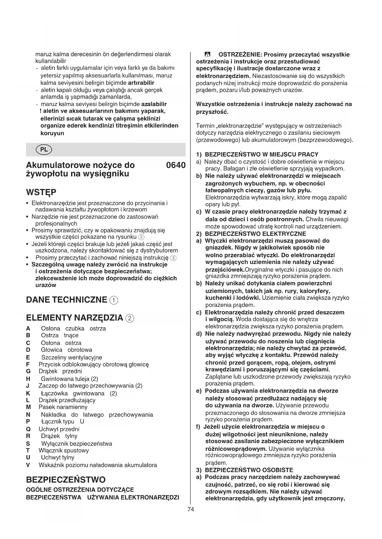 - Dikkatli biçimde yürütülen üretim ve test prosedürlerine rağmen alet arızalanırsa onarım işlemleri SKIL elektrikli74 - OSTRZEŻENIE: Prosimy przeczytać wszystkie ostrzeżenia i instrukcje oraz przestudiować specykację i ilustracje dostarczone wraz z elektronarzędziem. Niezastosowanie się do wszystkich podanych niżej instrukcji może doprowadzić do porażenia prądem, pożaru i/lub poważnych urazów. Wszystkie ostrzeżenia i instrukcje należy zachować na przyszłość. Termin „elektronarzędzie” występujący w ostrzeżeniach dotyczy narzędzia elektrycznego o zasilaniu sieciowym (przewodowego) lub akumulatorowym (bezprzewodowego).