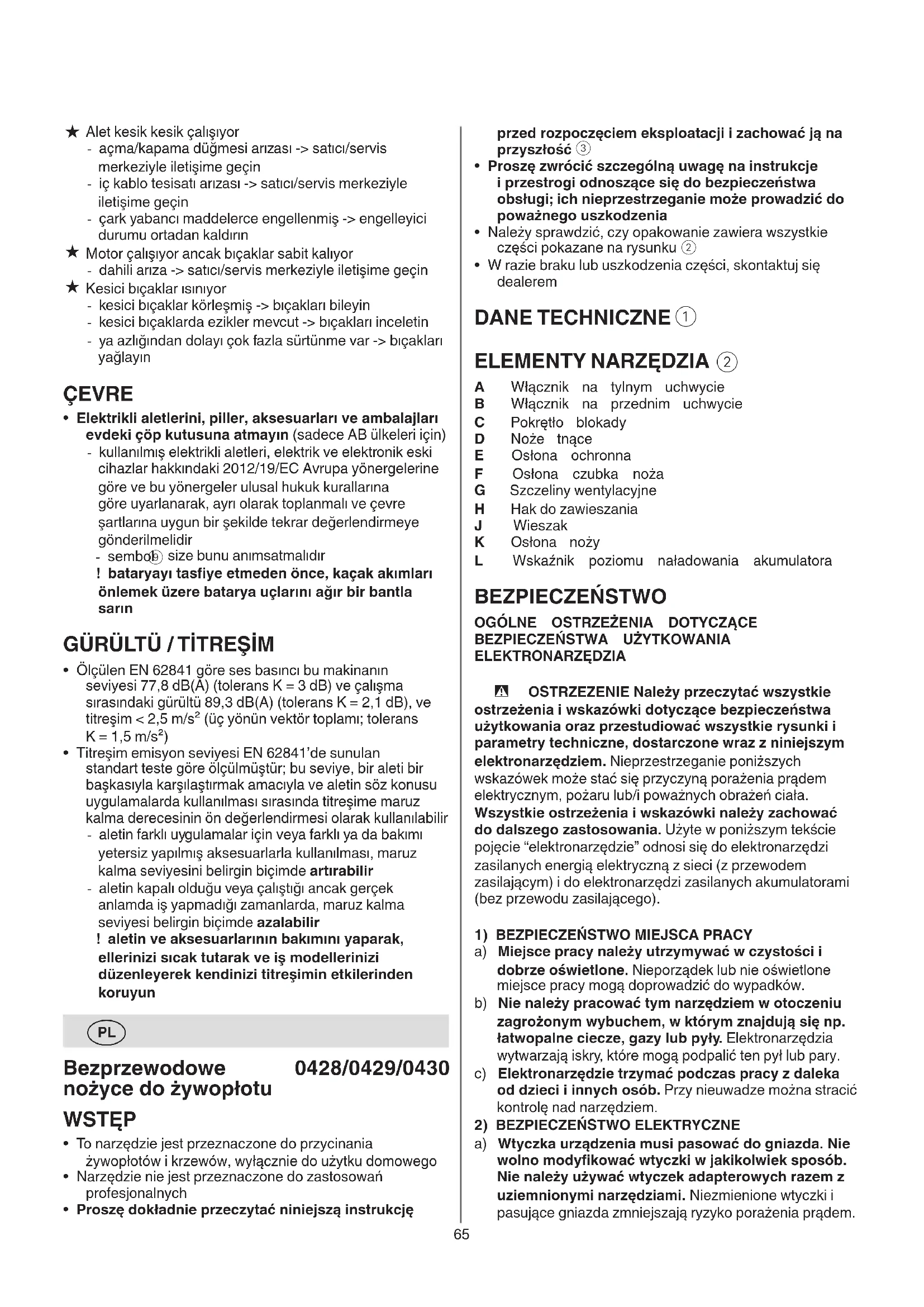 A Włącznik na tylnym uchwycie B Włącznik na przednim uchwycie C Pokrętło blokady D Noże tnące E Osłona ochronna F Osłona czubka noża G Szczeliny wentylacyjne H Hak do zawieszania J Wieszak K Osłona noży L Wskaźnik poziomu naładowania akumulatora BEZPIECZEŃSTWO