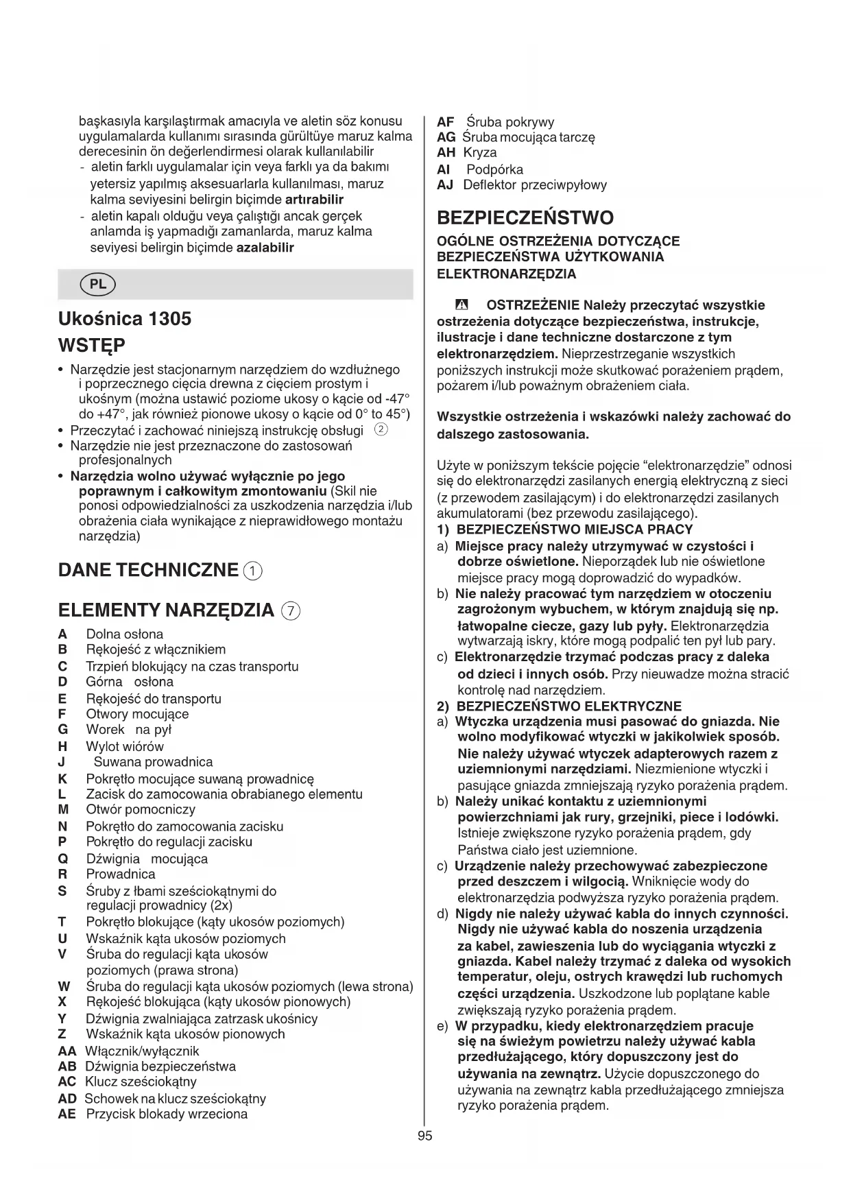c sıfırlayın95 AF Śruba pokrywy AG Śruba mocująca tarczę AH Kryza AI Podpórka AJ Deektor przeciwpyłowy BEZPIECZEŃSTWO