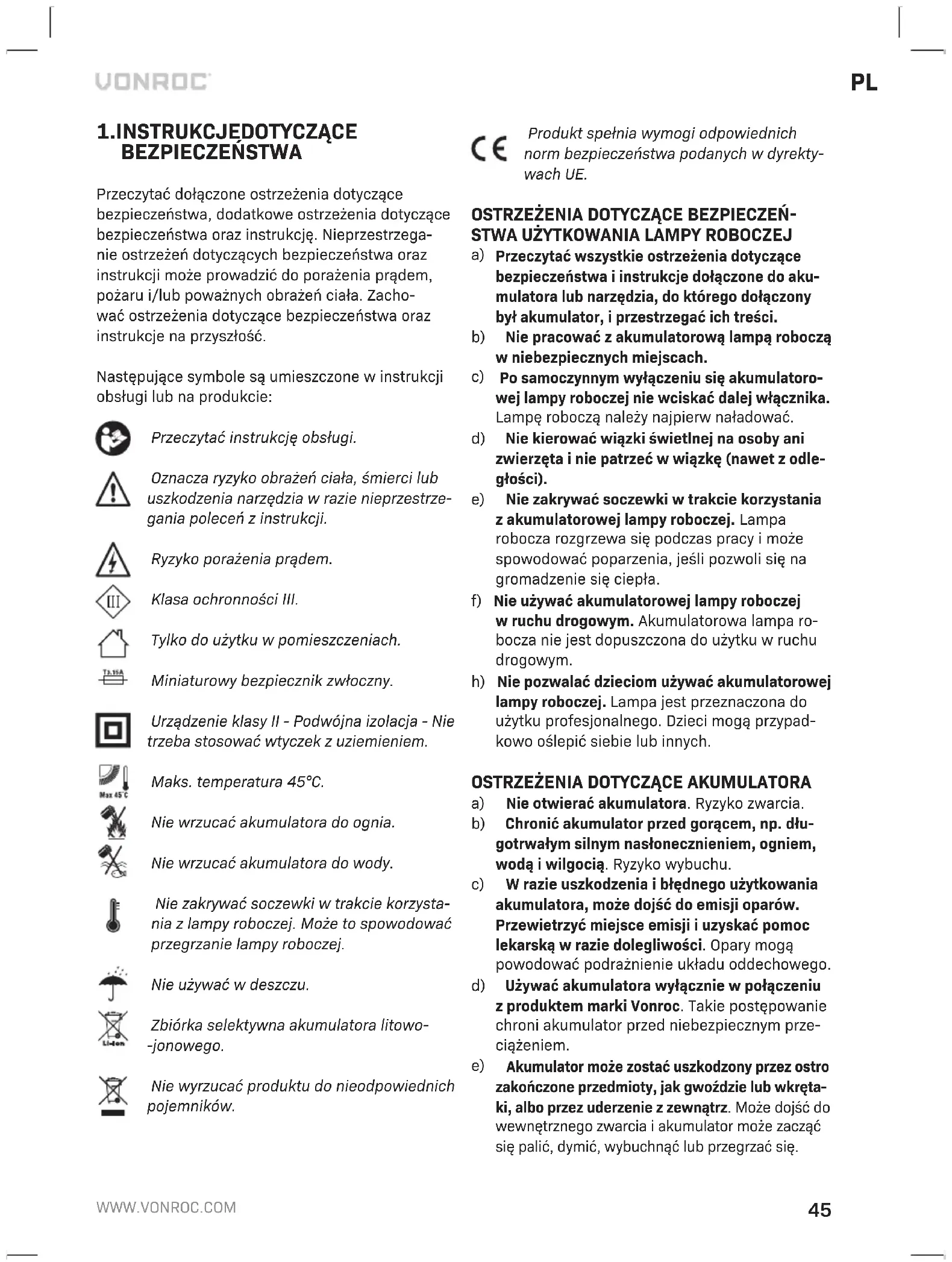 a) Nie otwierać akumulatora. Ryzyko zwarcia. b) Chronić akumulator przed gorącem, np. dłu- gotrwałym silnym nasłonecznieniem, ogniem, wodą iwilgocią. Ryzyko wybuchu. c) Wrazie uszkodzenia ibłędnego użytkowania akumulatora, może dojść do emisji oparów. Przewietrzyć miejsce emisji iuzyskać pomoc lekarską wrazie dolegliwości. Opary mogą powodować podrażnienie układu oddechowego. d) Używać akumulatora wyłącznie wpołączeniu zproduktem marki Vonroc. Takie postępowanie chroni akumulator przed niebezpiecznym prze- ciążeniem.