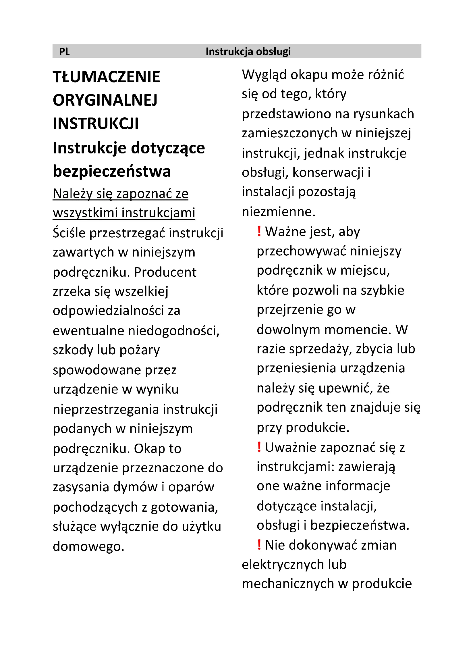 TŁUMACZENIE ORYGINALNEJ INSTRUKCJI Instrukcje dotyczące bezpieczeństwa Należy się zapoznać ze wszystkimi instrukcjami Ściśle przestrzegać instrukcji zawartych w niniejszym podręczniku. Producent zrzeka się wszelkiej odpowiedzialności za ewentualne niedogodności, szkody lub pożary spowodowane przez urządzenie w wyniku nieprzestrzegania instrukcji podanych w niniejszym podręczniku. Okap to urządzenie przeznaczone do zasysania dymów i oparów pochodzących z gotowania, służące wyłącznie do użytku domowego. Wygląd okapu może różnić się od tego, który przedstawiono na rysunkach zamieszczonych w niniejszej instrukcji, jednak instrukcje obsługi, konserwacji i instalacji pozostają niezmienne. ! Ważne jest, aby przechowywać niniejszy podręcznik w miejscu, które pozwoli na szybkie przejrzenie go w dowolnym momencie. W razie sprzedaży, zbycia lub przeniesienia urządzenia należy się upewnić, że podręcznik ten znajduje się przy produkcie. ! Uważnie zapoznać się z instrukcjami: zawierają one ważne informacje dotyczące instalacji, obsługi i bezpieczeństwa. ! Nie dokonywać zmian elektrycznych lub mechanicznych w produkciePL