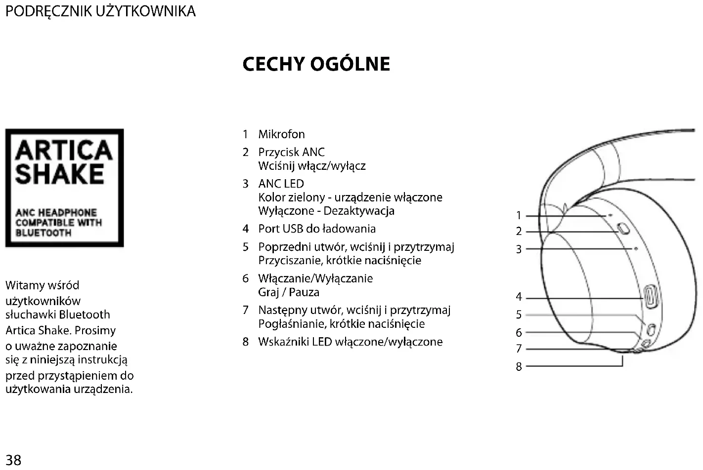 Mikrofon Przycisk ANC Wciśnij włącz/wyłącz ANC LED Kolor zielony - urządzenie włączone Wyłączone - Dezaktywacja Port USB do ładowania Poprzedni utwór, wciśnij i przytrzymaj Przyciszanie, krótkie naciśnięcie Włączanie/Wyłączanie Graj / Pauza Następny utwór, wciśnij i przytrzymaj Pogłaśnianie, krótkie naciśnięcie Wskaźniki LED włączone/wyłączone