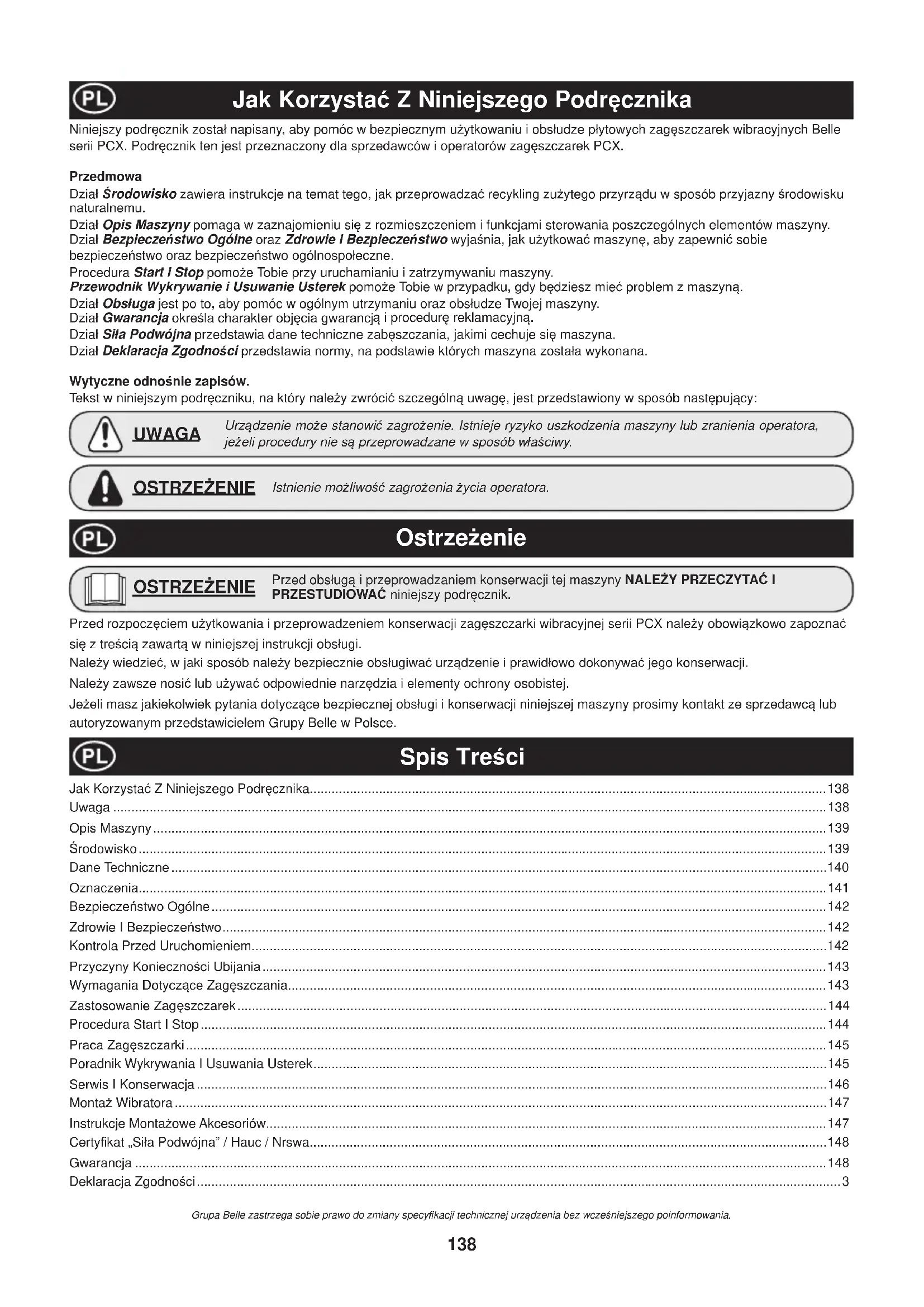 - Moottorin sytytystulppa Altrad Belle ja/tai sen valtuuttamat maahantuojat, johtajat, työntekijät tai vakuuttajat eivät ole vastuussa välillisistä tai muista vahingoista, tappioista tai mistään kuluista, jotka aiheutuvat laitteen käyttökelvottomuudesta tai muusta laitteen käytöstä johtuvasta syystä. Takuu hakemus Kaikki takuuhakemukset osoitetaan Several Oy:lle, puhelimella, Faksilla, sähköpostilla tai kirjallisesti. Takuuhakemukset: Puh. 09-348 9110, Faksi: 09-348 9221 Sähköposti: info@several.¿ Kirjallisesti: Several Oy Takkatie 10 E 00370 Helsinki138 Jak Korzystaü Z Niniejszego PodrĊcznika Urządzenie moĪe stanowiü zagroĪenie. Istnieje ryzyko uszkodzenia maszyny lub zranienia operatora, jeĪeli procedury nie są przeprowadzane w sposób wáaĞciwy. UWAGA OstrzeĪenie Spis TreĞci Niniejszy podrĊcznik zostaá napisany, aby pomóc w bezpiecznym uĪytkowaniu i obsáudze páytowych zagĊszczarek wibracyjnych Belle serii PCX. PodrĊcznik ten jest przeznaczony dla sprzedawców i operatorów zagĊszczarek PCX. Przedmowa Dziaá ĝrodowisko zawiera instrukcje na temat tego, jak przeprowadzaü recykling zuĪytego przyrządu w sposób przyjazny Ğrodowisku naturalnemu. Dziaá Opis Maszyny pomaga w zaznajomieniu siĊ z rozmieszczeniem i funkcjami sterowania poszczególnych elementów maszyny. Dziaá BezpieczeĔstwo Ogólne oraz Zdrowie i BezpieczeĔstwo wyjaĞnia, jak uĪytkowaü maszynĊ, aby zapewniü sobie bezpieczeĔstwo oraz bezpieczeĔstwo ogólnospoáeczne. Procedura Start i Stop pomoĪe Tobie przy uruchamianiu i zatrzymywaniu maszyny. Przewodnik Wykrywanie i Usuwanie Usterek pomoĪe Tobie w przypadku, gdy bĊdziesz mieü problem z maszyną. Dziaá Obsáuga jest po to, aby pomóc w ogólnym utrzymaniu oraz obsáudze Twojej maszyny. Dziaá Gwarancja okreĞla charakter objĊcia gwarancj ą i procedurĊ reklamacyjną. Dziaá Siáa Podwójna przedstawia dane techniczne zabĊszczania, jakimi cechuje siĊ maszyna. Dziaá Deklaracja ZgodnoĞci przedstawia normy, na podstawie których maszyna zostaáa wykonana. Wytyczne odnoĞnie zapisów. Tekst w niniejszym podrĊczniku, na który naleĪy zwróciü szczególną uwagĊ, jest przedstawiony w sposób nastĊpujący: Istnienie moĪliwoĞü zagroĪenia Īycia operatora. OSTRZEĩENIE Przed obsáugą i przeprowadzaniem konserwacji tej maszyny NALEĩY PRZECZYTAû I PRZESTUDIOWAû niniejszy podrĊcznik. OSTRZEĩENIE Przed rozpoczĊciem uĪytkowania i przeprowadzeniem konserwacji zagĊszczarki wibracyjnej serii PCX naleĪy obowiązkowo zapoznaü siĊ z treĞcią zawartą w niniejszej instrukcji obsáugi. NaleĪy wiedzieü, w jaki sposób naleĪy bezpiecznie obsáugiwaü urządzenie i prawidáowo dokonywaü jego konserwacji. NaleĪy zawsze nosiü lub uĪywaü odpowiednie narzĊdzia i elementy ochrony osobistej. JeĪeli masz jakiekolwiek pytania dotyczące bezpiecznej obsáugi i konserwacji niniejszej maszyny prosimy kontakt ze sprzedawcą lub autoryzowanym przedstawicielem Grupy Belle w Polsce. Jak Korzystaü Z Niniejszego PodrĊcznika..............................................................................................................................................138 Uwaga ....................................................................................................................................................................................................138 Opis Maszyny .........................................................................................................................................................................................139 ĝrodowisko .............................................................................................................................................................................................139 Dane Techniczne ....................................................................................................................................................................................140 Oznaczenia.............................................................................................................................................................................................141 BezpieczeĔstwo Ogólne .........................................................................................................................................................................142 Zdrowie I BezpieczeĔstwo ......................................................................................................................................................................142 Kontrola Przed Uruchomieniem..............................................................................................................................................................142 Przyczyny KoniecznoĞci Ubijania ...........................................................................................................................................................143 Wymagania Dotyczące ZagĊszczania ....................................................................................................................................................143 Zastosowanie Zag Ċszczarek ..................................................................................................................................................................144 Procedura Start I Stop ............................................................................................................................................................................144 Praca ZagĊszczarki ................................................................................................................................................................................145 Poradnik Wykrywania I Usuwania Usterek .............................................................................................................................................145 Serwis I Konserwacja ..................................