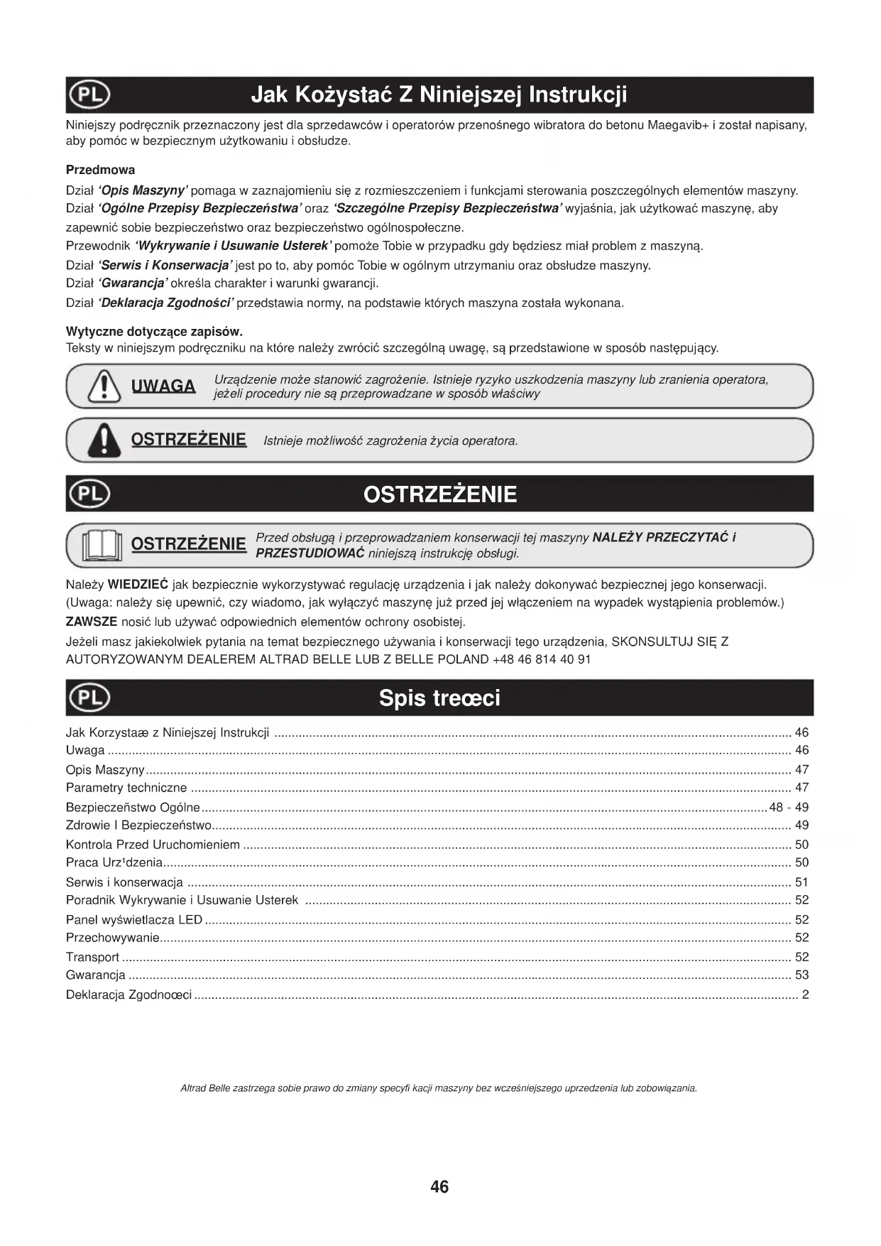 niá pozostaáe puste miejsce. Nie wyáączaj wibratora do momentu jego peánego wycofania. SzybkoĞü wycofywania to okoáo 80 mm/s. Kiedy prawie caáy wibrator juĪ zostaá wyciągniĊty, wyjmij resztĊ energicznym ruchem, aby uniknąü wstrząĞniĊcia powierzchni.51 Urządzenie ¿ rmy Altrad Belle jest tak skonstruowane, aby zapewniü bezusterkową pracĊ przez wiele lat. Niemniej jednak istotne jest, aby przeprowadzaü prostą regularną konserwacjĊ urządzenia zgodnie z opisaną w tym dziale procedurą. Zaleca siĊ, aby wszystkie waĪniejsze prace konserwacyjno-remontowe byáy przeprowadzane przez autoryzowanego przedstawiciela ¿ rmy Altrad Belle. Zawsze naleĪy stosowaü oryginalne czĊĞci zamienne ¿ rmy Altrad Belle. UĪywanie czĊĞci podrobionych moĪe prowadziü do uniewaĪnienia gwarancji. Z róĪnych wzglĊdów bezpieczeĔstwa i ryzyka podczas konserwacji odradzamy mycie i ponowne oliwienie uĪywanych, rozebranych áoĪysk i ponowne ich skáadanie. Zalecamy natomiast zastosowanie nowych áoĪysk kulkowych lub áoĪysk do wibratorów ¿ rmy Altrad Belle, które są produkcyjnie smarowane, zgodnie z wymaganiami. Naprawy, poáączenia i montaĪu naleĪy dokonywaü wyáącznie pod warunkiem, Īe: