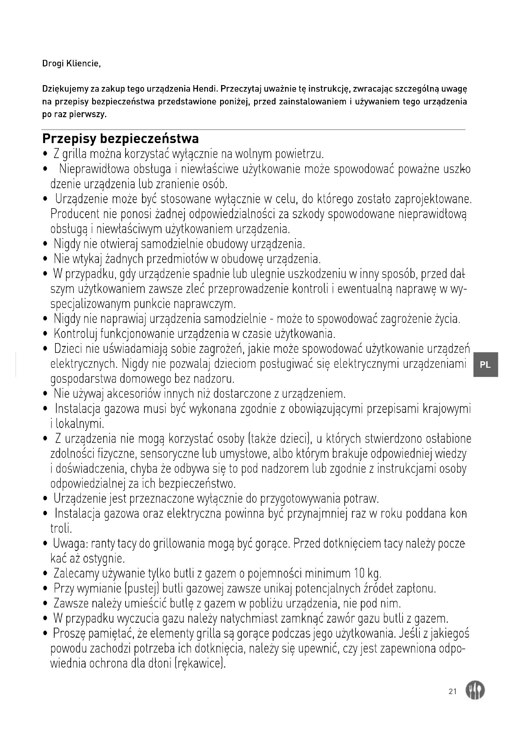 Drogi Kliencie, Dziękujemy za zakup tego urządzenia Hendi. Przeczytaj uważnie tę instrukcję, zwracając szczególną uwagę na przepisy bezpieczeństwa przedstawione poniżej, przed zainstalowaniem i używaniem tego urządzenia po raz pierwszy. Przepisy bezpieczeństwa