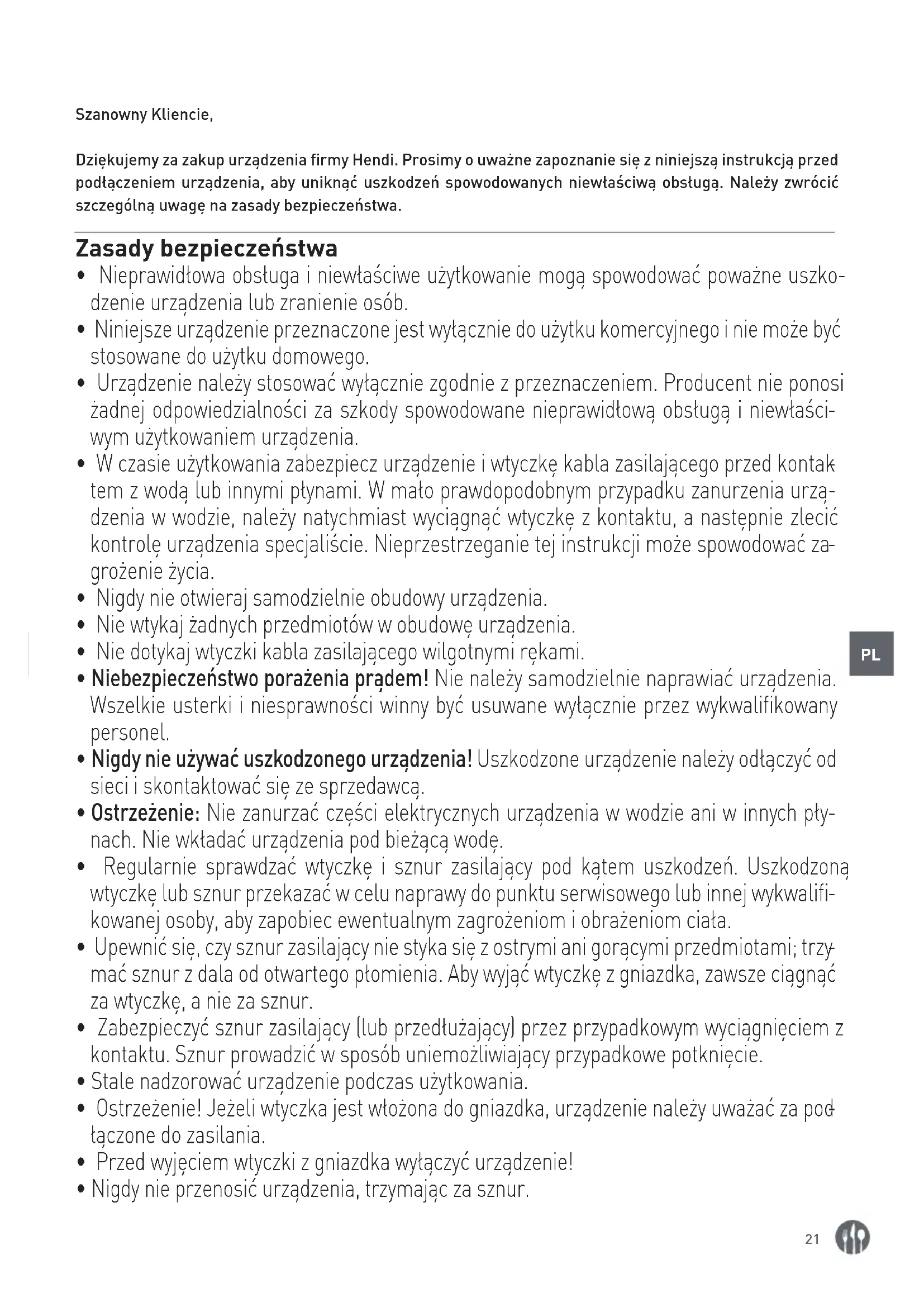 Szanowny Kliencie, Dziękujemy za zakup urządzenia firmy Hendi. Prosimy o uważne zapoznanie się z niniejszą instrukcją przed podłączeniem urządzenia, aby uniknąć uszkodzeń spowodowanych niewłaściwą obsługą. Należy zwrócić szczególną uwagę na zasady bezpieczeństwa. Zasady bezpieczeństwa