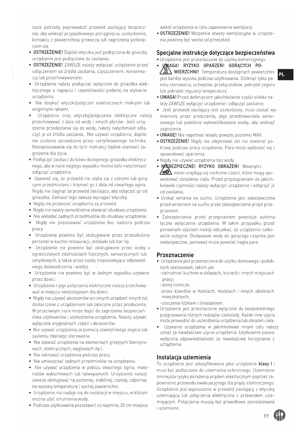 Urządzenie jest przeznaczone wyłącznie do bezpośredniego podgrzewania różnych rodzajów czekolady. Każde inne użycie może prowadzić do uszkodzenia urządzenia lub obrażeń ciała.