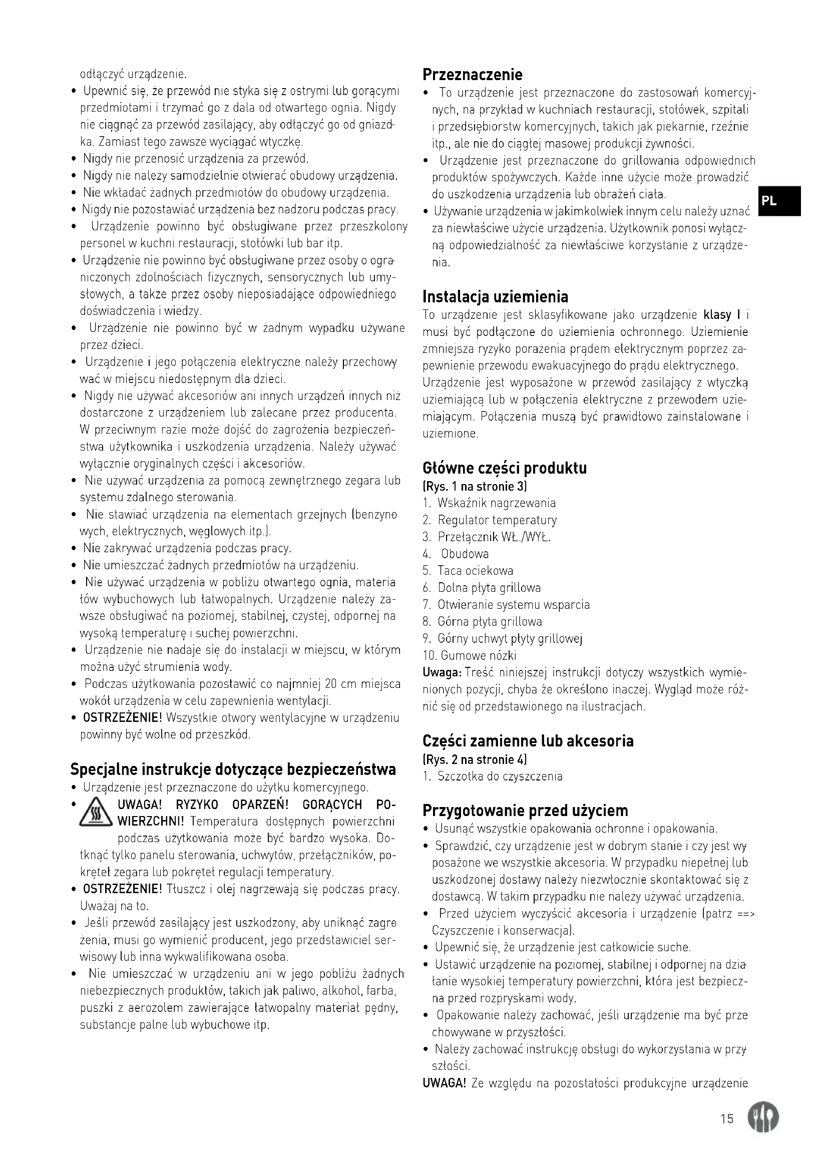 - Urządzenie jest przeznaczone do grillowania odpowiednich produktów spożywczych. Każde inne użycie może prowadzić do uszkodzenia urządzenia lub obrażeń ciała.