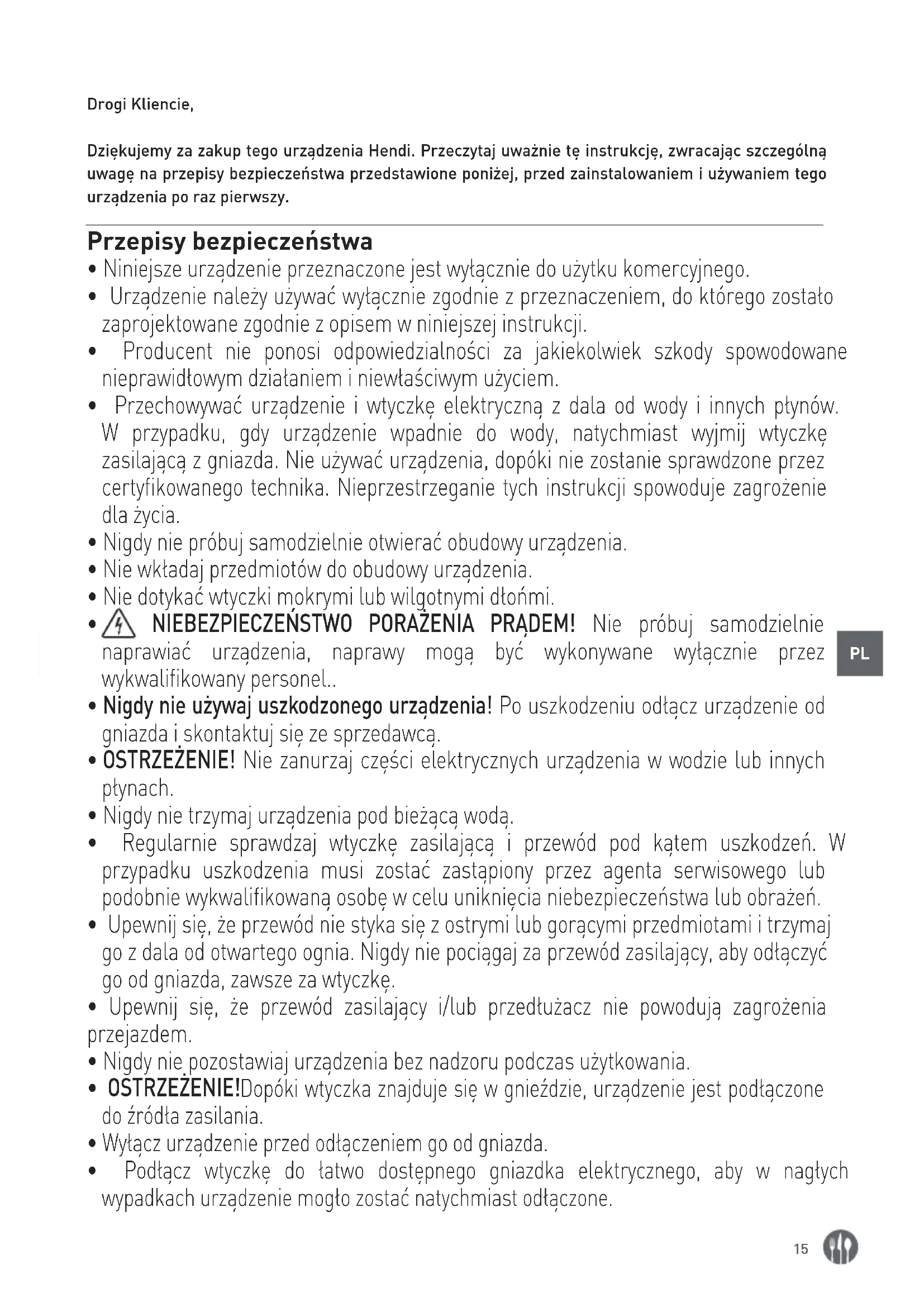 Drogi Kliencie, Dziękujemy za zakup tego urządzenia Hendi. Przeczytaj uważnie tę instrukcję, zwracając szczególną uwagę na przepisy bezpieczeństwa przedstawione poniżej, przed zainstalowaniem i używaniem tego urządzenia po raz pierwszy. Przepisy bezpieczeństwa