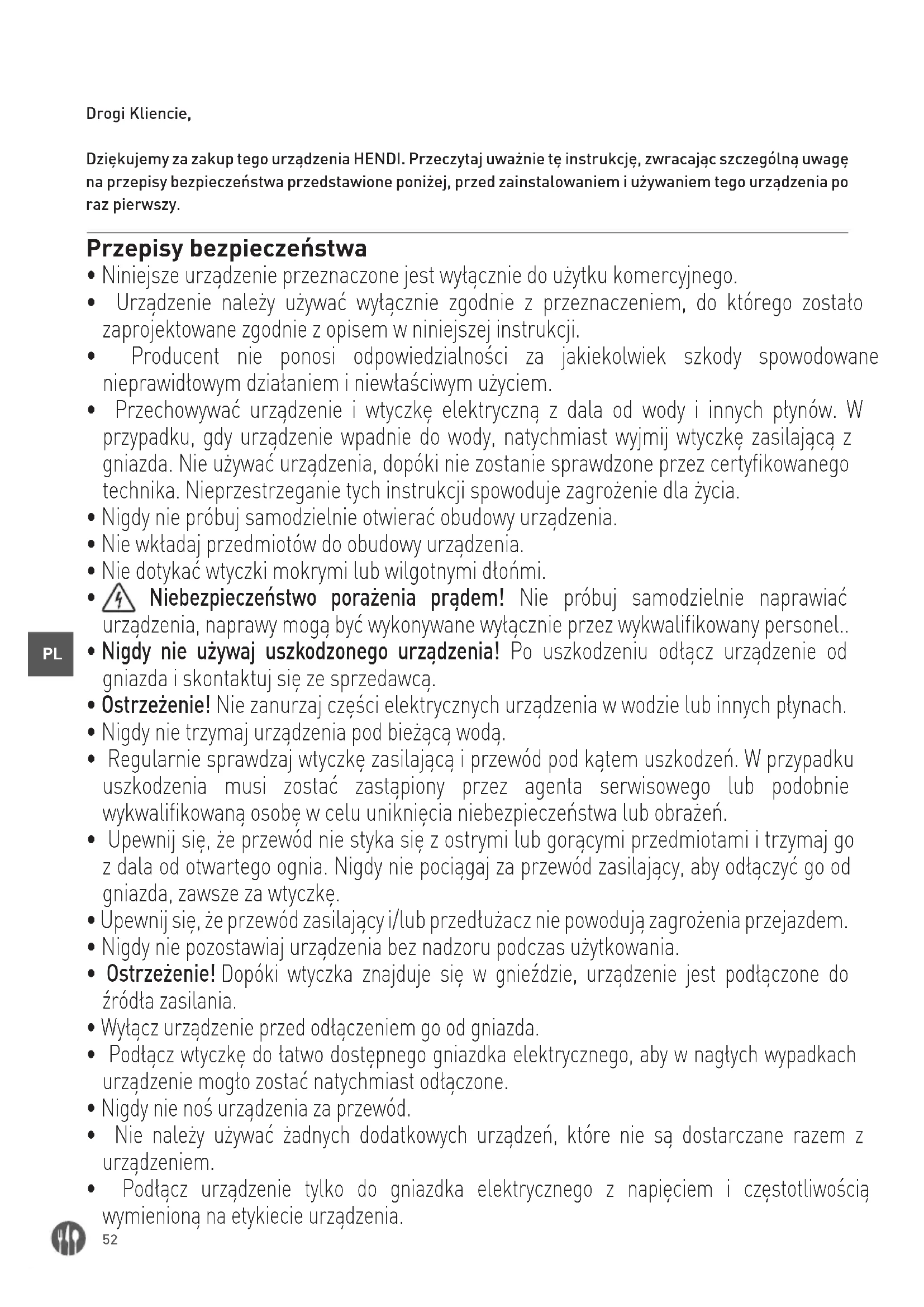 Drogi Kliencie, Dziękujemy za zakup tego urządzenia HENDI. Przeczytaj uważnie tę instrukcję, zwracając szczególną uwagę na przepisy bezpieczeństwa przedstawione poniżej, przed zainstalowaniem i używaniem tego urządzenia po raz pierwszy. Przepisy bezpieczeństwa