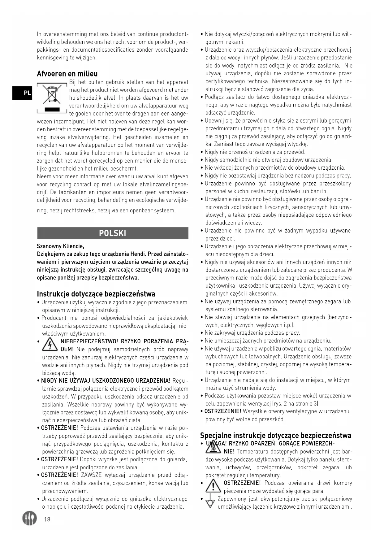- UWAGA! RYZYKO OPARZEŃ! GORĄCE POWIERZCH- NIE! Temperatura dostępnych powierzchni jest bar- dzo wysoka podczas użytkowania. Dotykaj tylko panelu stero- wania, uchwytów, przełączników, pokręteł zegara lub pokręteł regulacji temperatury.