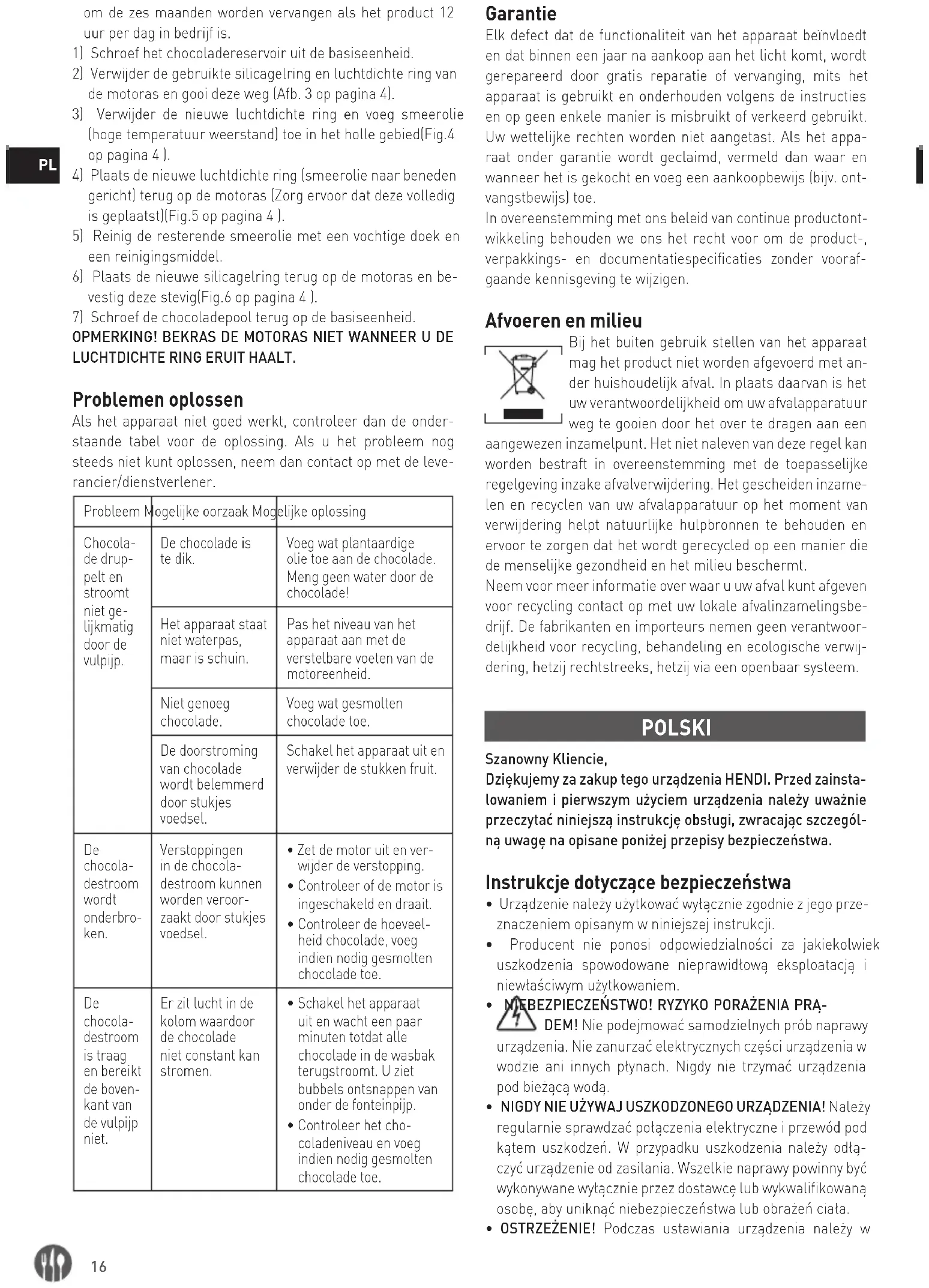 Sprawdź poziom czekolady i w razie potrzeby dodaj rozto- pioną czekoladę. Gwarancja Każda wada bądź usterka powodująca niewłaściwe funkcjo- nowanie urządzenia, która ujawni się w ciągu jednego roku od daty zakupu, zostanie bezpłatnie usunięta lub urządzenie zostanie wymienione na nowe, o ile było użytkowane i konser- wowane zgodnie z instrukcją obsługi i nie było wykorzystywa- ne w niewłaściwy sposób lub niezgodnie z przeznaczeniem. Postanowienie to w żadnej mierze nie narusza innych praw użytkownika wynikających z przepisów prawa. W przypadku zgłoszenia urządzenia do naprawy lub wymiany w ramach gwarancji należy podać miejsce i datę zakupu urządzenia i dołączyć dowód zakupu (np. paragon). Zgodnie z naszą polityką ciągłego doskonalenia wyrobów zastrzegamy sobie prawo do wprowadzania bez uprzedzenia zmian w wyrobie, opakowaniu oraz danych technicznych po- dawanych w dokumentacji.20