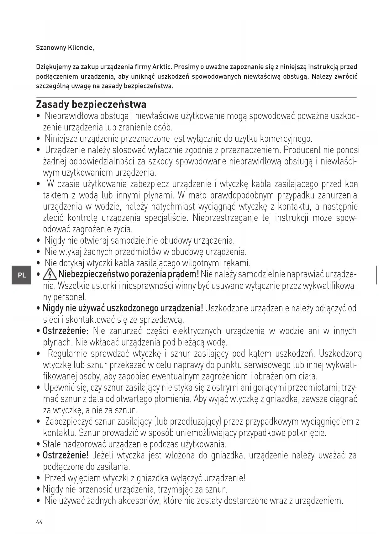 Szanowny Kliencie, Dziękujemy za zakup urządzenia firmy Arktic. Prosimy o uważne zapoznanie się z niniejszą instrukcją przed podłączeniem urządzenia, aby uniknąć uszkodzeń spowodowanych niewłaściwą obsługą. Należy zwrócić szczególną uwagę na zasady bezpieczeństwa. Zasady bezpieczeństwa