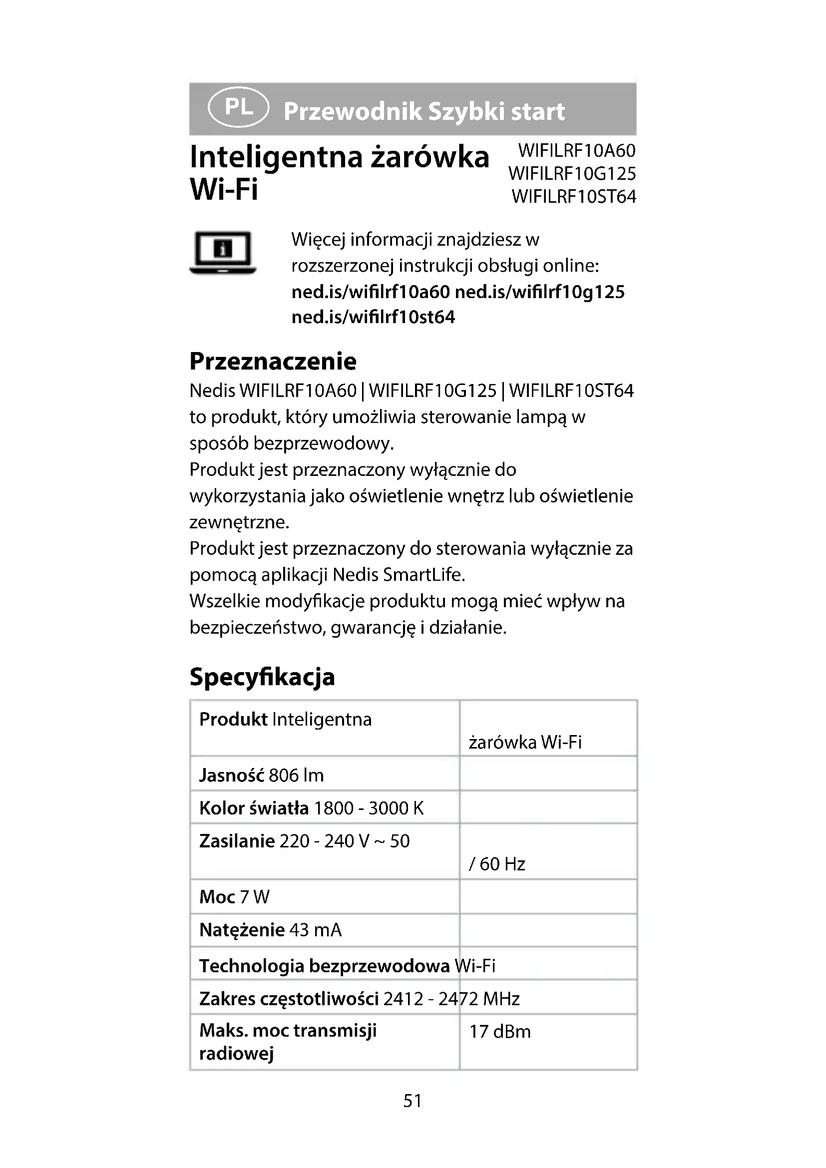 Przewodnik Szybki start Inteligentna żarówka Wi-Fi WIFILRF10A60 WIFILRF10G125 WIFILRF10ST64 Więcej informacji znajdziesz w rozszerzonej instrukcji obsługi online: ned.is/wilrf10a60 ned.is/wilrf10g125 ned.is/wilrf10st64 Przeznaczenie Nedis WIFILRF10A60 | WIFILRF10G125 | WIFILRF10ST64 to produkt, który umożliwia sterowanie lampą w sposób bezprzewodowy. Produkt jest przeznaczony wyłącznie do wykorzystania jako oświetlenie wnętrz lub oświetlenie zewnętrzne. Produkt jest przeznaczony do sterowania wyłącznie za pomocą aplikacji Nedis SmartLife. Wszelkie modykacje produktu mogą mieć wpływ na bezpieczeństwo, gwarancję i działanie. Specykacja Produkt Inteligentna żarówka Wi-Fi Jasność 806 lm Kolor światła 1800 - 3000 K Zasilanie 220 - 240 V ~ 50 / 60 Hz Moc 7 W Natężenie 43 mA Technologia bezprzewodowa Wi-Fi Zakres częstotliwości 2412 - 2472 MHz Maks. moc transmisji radiowej 17 dBm52 Oprawa E27 Materiał Szkło Numer katalogowy Wymiary Waga WIFILRF10A60 Ø 60 x 105 mm 30 g WIFILRT10G125 Ø 125 x 172 mm 100 g WIFILRF10ST64 Ø 64 x 142 mm 46 g Główne części (rysunek A) 1 Żarówka 2 Żarnik 3 Styk elektryczny Instrukcje bezpieczeństwa