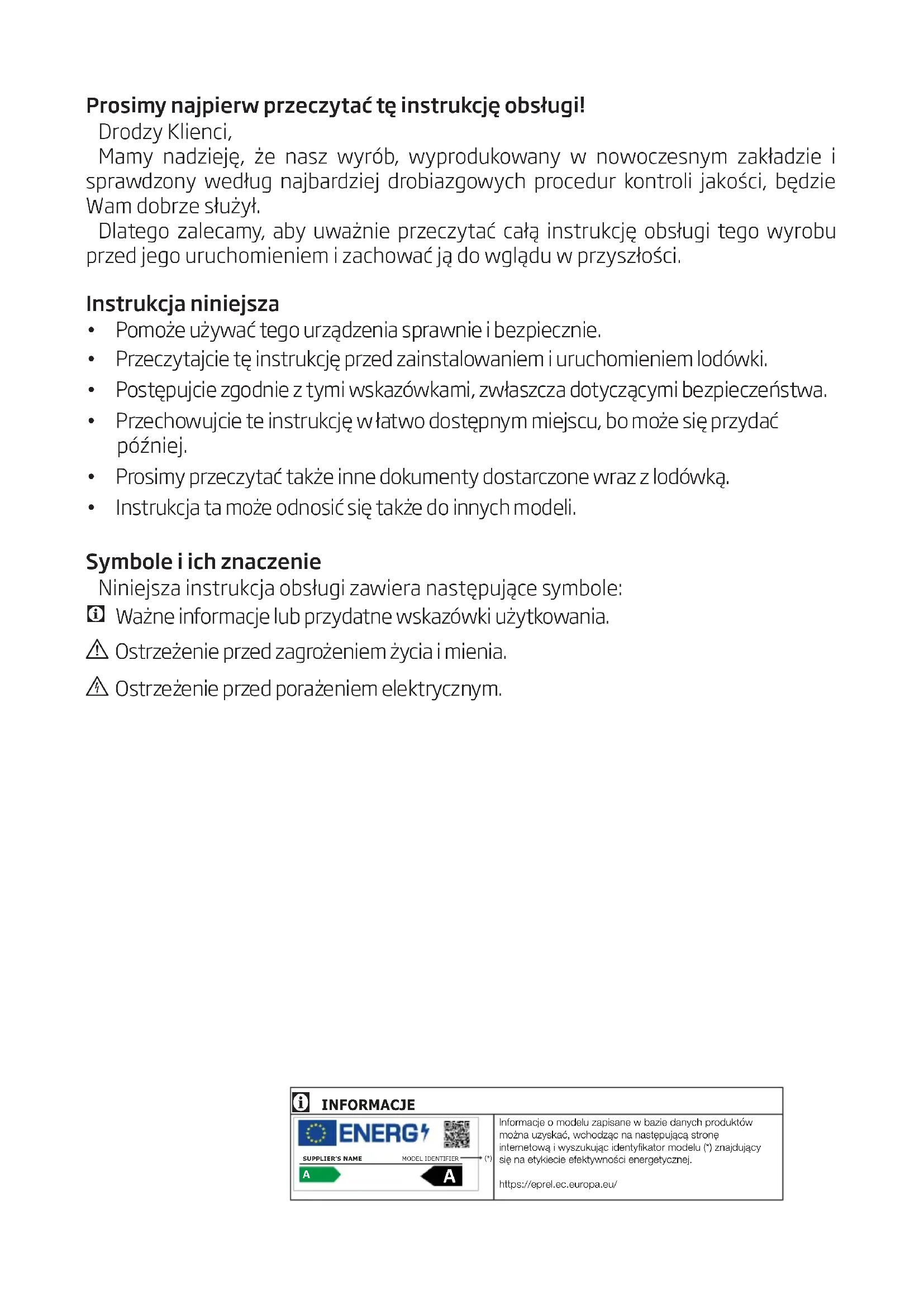 - Przeczytajcie tę instrukcję przed zainstalowaniem i uruchomieniem lodówki.