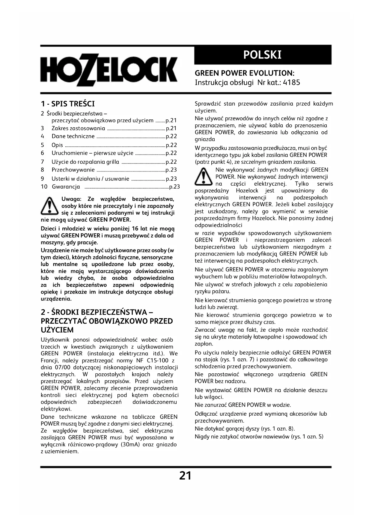 2 Środki bezpieczeństwa – przeczytać obowiązkowo przed użyciem ........ p.21 3 Zakres zastosowania ................................................ p.21 4 Dane techniczne ......................................................... p.22 5 Opis ................................................................................... p.22 6 Uruchomienie – pierwsze użycie ......................... p.22 7 Użycie do rozpalania grilla ....................................p.22 8 Przechowywanie .........................................................p.23 9 Usterki w działaniu / usuwanie ............................ p.23 10 Gwarancja ......................................................................p.23 Uwaga: Ze względów bezpieczeństwa, osoby które nie przeczytały i nie zapoznały się z zaleceniami podanymi w tej instrukcji nie mogą używać GREEN POWER. Dzieci i młodzież w wieku poniżej 16 lat nie mogą używać GREEN POWER i muszą przebywać z dala od maszyny, gdy pracuje. Urządzenie nie może być użytkowane przez osoby (w tym dzieci), których zdolności fizyczne, sensoryczne lub mentalne są upośledzone lub przez osoby, które nie mają wystarczającego doświadczenia lub wiedzy chyba, że osoba odpowiedzialna za ich bezpieczeństwo zapewni odpowiednią opiekę i przekaże im instrukcje dotyczące obsługi urządzenia.