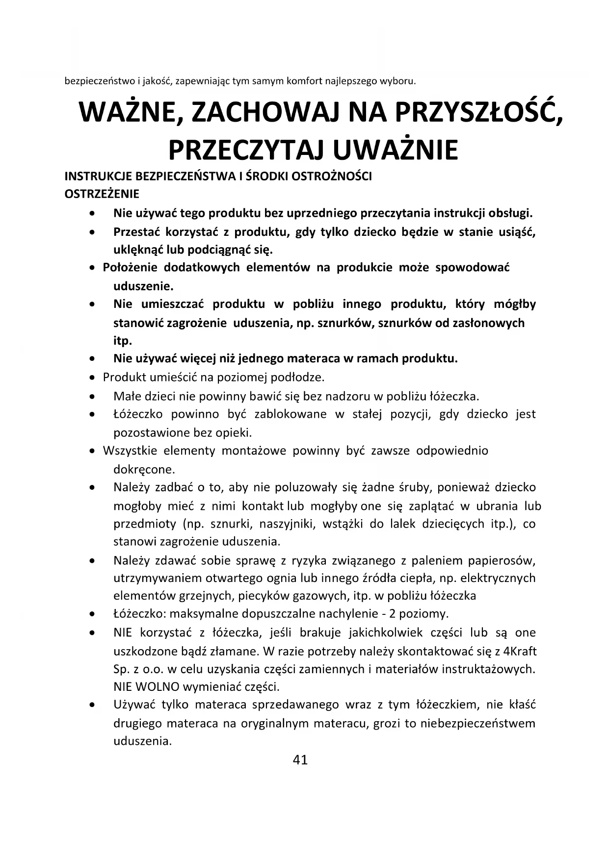 - NIE korzystać z łóżeczka, jeśli brakuje jakichkolwiek części lub są one uszkodzone bądź złamane. W razie potrzeby należy skontaktować się z 4Kraft Sp. z o.o. w celu uzyskania części zamiennych i materiałów instruktażowych. NIE WOLNO wymieniać części.