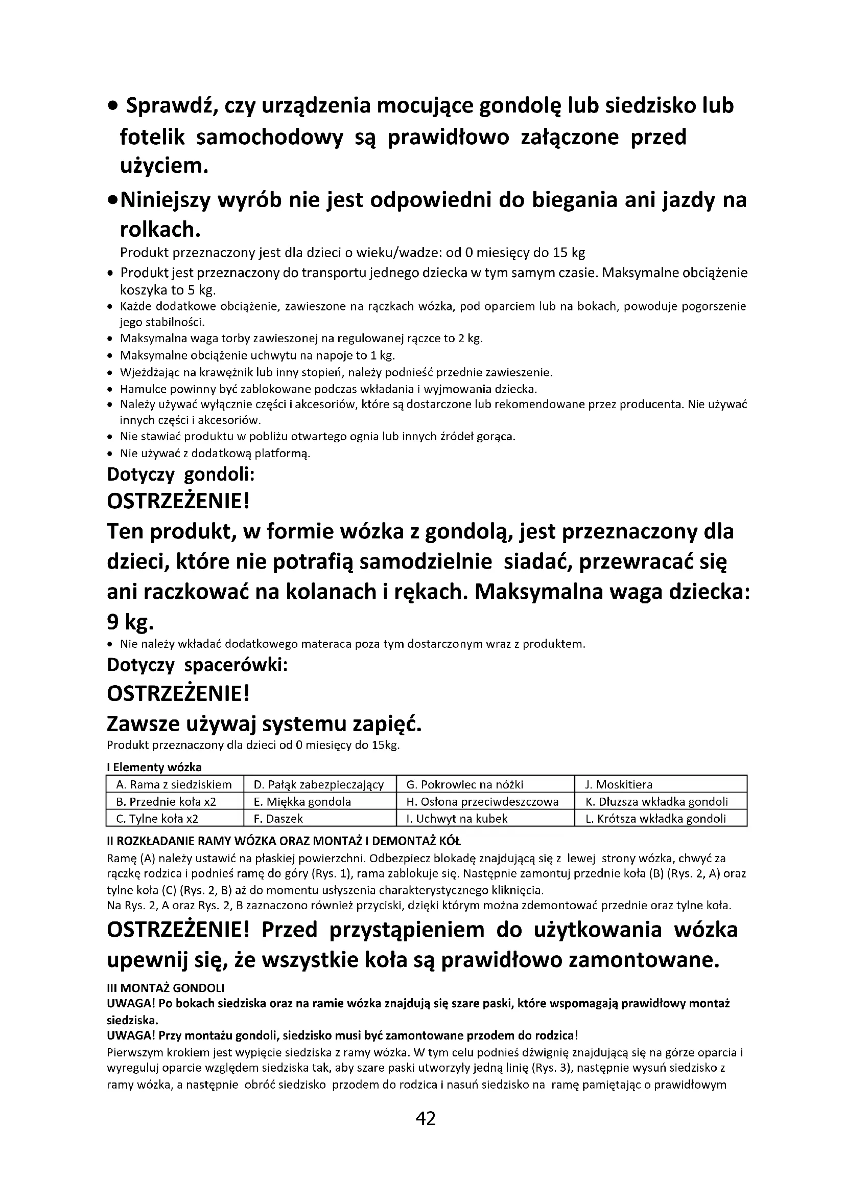 - Nie używać z dodatkową platformą. Dotyczy gondoli: OSTRZEŻENIE! Ten produkt, w formie wózka z gondolą, jest przeznaczony dla dzieci, które nie potrafią samodzielnie siadać, przewracać się ani raczkować na kolanach i rękach. Maksymalna waga dziecka: 9 kg.