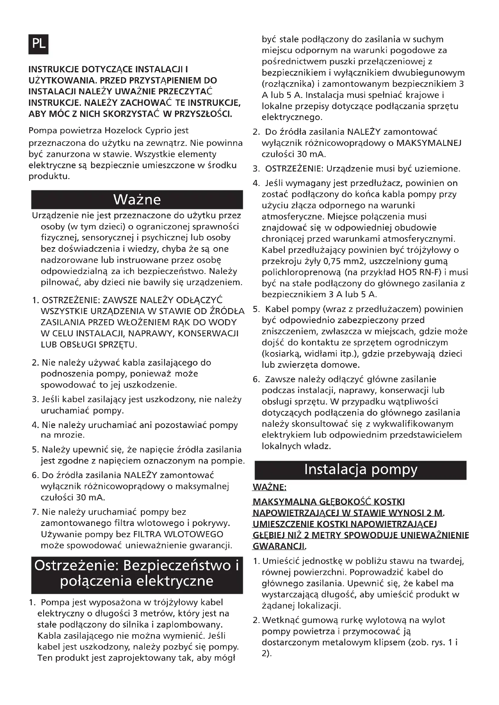 INSTRUKCJE. NALEŻY ZACHOWAĆ TE INSTRUKCJE, ABY MÓC Z NICH SKORZYSTAĆ W PRZYSZŁOŚCI. Pompa powietrza Hozelock Cyprio jest przeznaczona do użytku na zewnątrz. Nie powinna być zanurzona w stawie. Wszystkie elementy elektryczne są bezpiecznie umieszczone w środku produktu. Urządzenie nie jest przeznaczone do użytku przez osoby (w tym dzieci) o ograniczonej sprawności fizycznej, sensorycznej i psychicznej lub osoby bez doświadczenia i wiedzy, chyba że są one nadzorowane lub instruowane przez osobę odpowiedzialną za ich bezpieczeństwo. Należy pilnować, aby dzieci nie bawiły się urządzeniem.