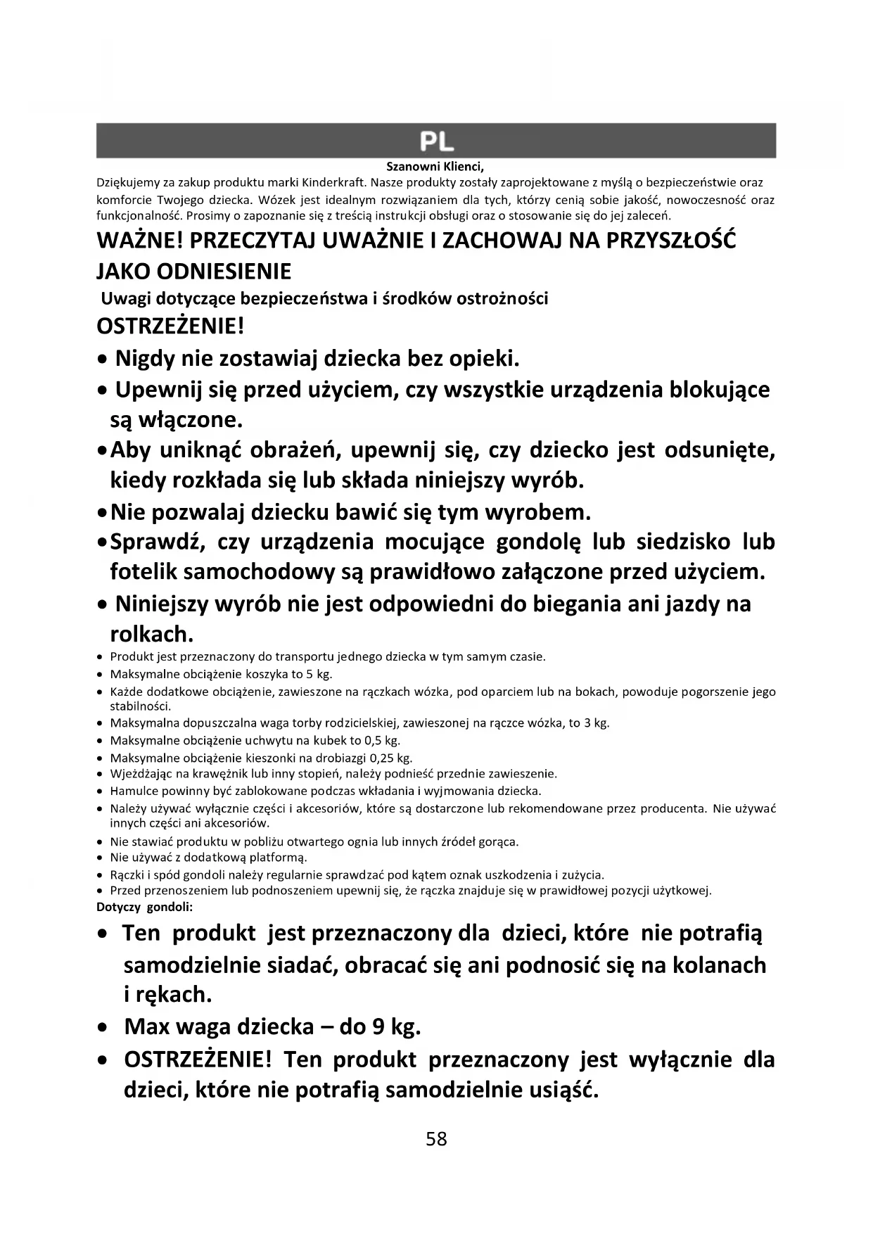 Alle rechten op deze uitgave komen uitsluitend toe aan 4Kraft Sp. z o.o. Elk ongeoorloofd gebruik ervan in strijd met de bestemming ervan, waaronder met name: het gebruiken, kopiëren, reproduceren, ter beschikking stellen - in zijn geheel of gedeeltelijk zonder toestemming van 4Kraft Sp. z o.o. - kan tot rechtsgevolgen leiden.58 Szanowni Klienci, Dziękujemy za zakup produktu marki Kinderkraft. Nasze produkty zostały zaprojektowane z myślą o bezpieczeństwie oraz komforcie Twojego dziecka. Wózek jest idealnym rozwiązaniem dla tych, którzy cenią sobie jakość, nowoczesność oraz funkcjonalność. Prosimy o zapoznanie się z treścią instrukcji obsługi oraz o stosowanie się do jej zaleceń. WAŻNE! PRZECZYTAJ UWAŻNIE I ZACHOWAJ NA PRZYSZŁOŚĆ JAKO ODNIESIENIE Uwagi dotyczące bezpieczeństwa i środków ostrożności OSTRZEŻENIE!