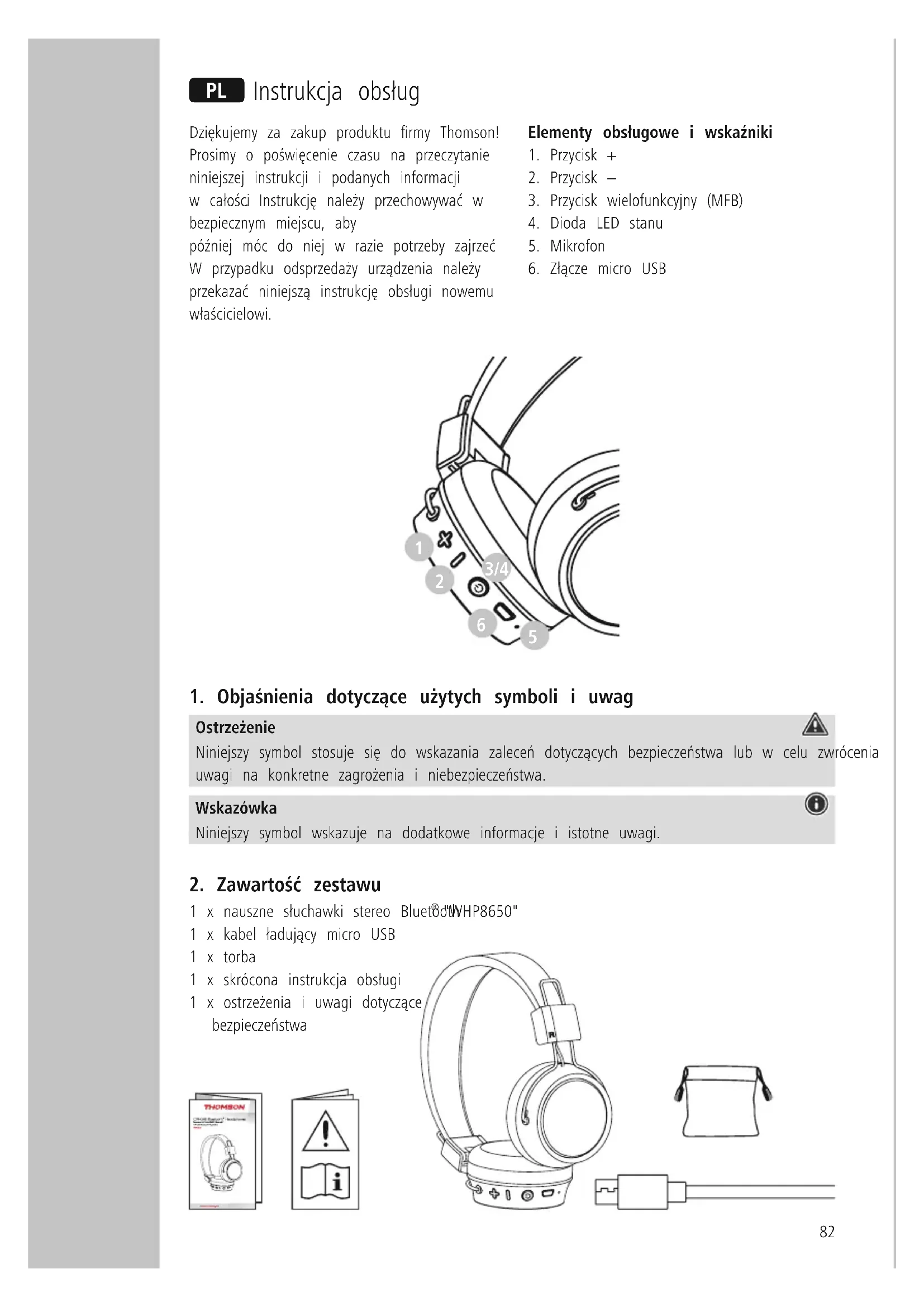 "WHP8650" 1 x kabel ładujący micro USB 1 x torba 1 x skrócona instrukcja obsługi 1 x ostrzeżenia i uwagi dotyczące bezpieczeństwa P Instrukcja obsług