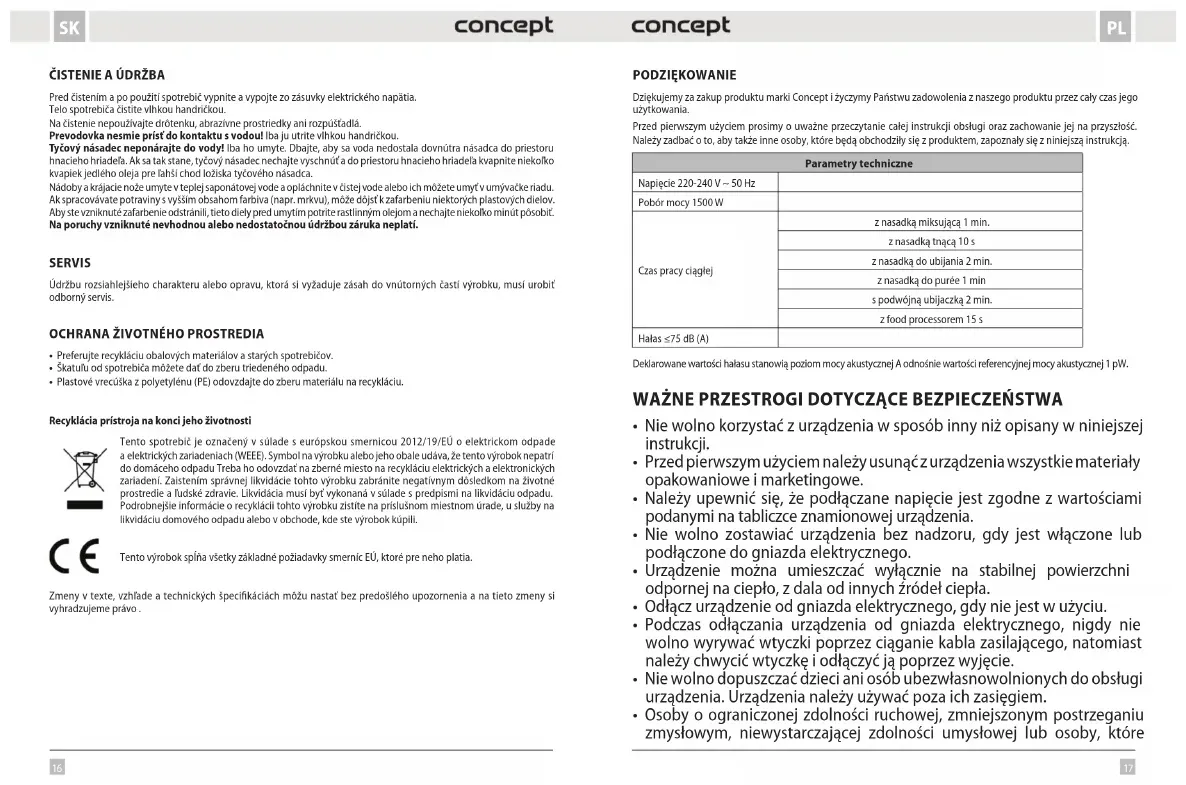PODZIĘKOWANIE Dziękujemy za zakup produktu marki Concept i życzymy Państwu zadowolenia z naszego produktu przez cały czas jego użytkowania. Przed pierwszym użyciem prosimy o uważne przeczytanie całej instrukcji obsługi oraz zachowanie jej na przyszłość. Należy zadbać o to, aby także inne osoby, które będą obchodziły się z produktem, zapoznały się z niniejszą instrukcją. Parametry techniczne Napięcie 220-240 V ~ 50 Hz Pobór mocy 1500 W Czas pracy ciągłej z nasadką miksującą 1 min. z nasadką tnącą 10 s z nasadką do ubijania 2 min. z nasadką do purée 1 min s podwójną ubijaczką 2 min. z food processorem 15 s Hałas ≤75 dB (A) Deklarowane wartości hałasu stanowią poziom mocy akustycznej A odnośnie wartości referencyjnej mocy akustycznej 1 pW. WAŻNE PRZESTROGI DOTYCZĄCE BEZPIECZEŃSTWA