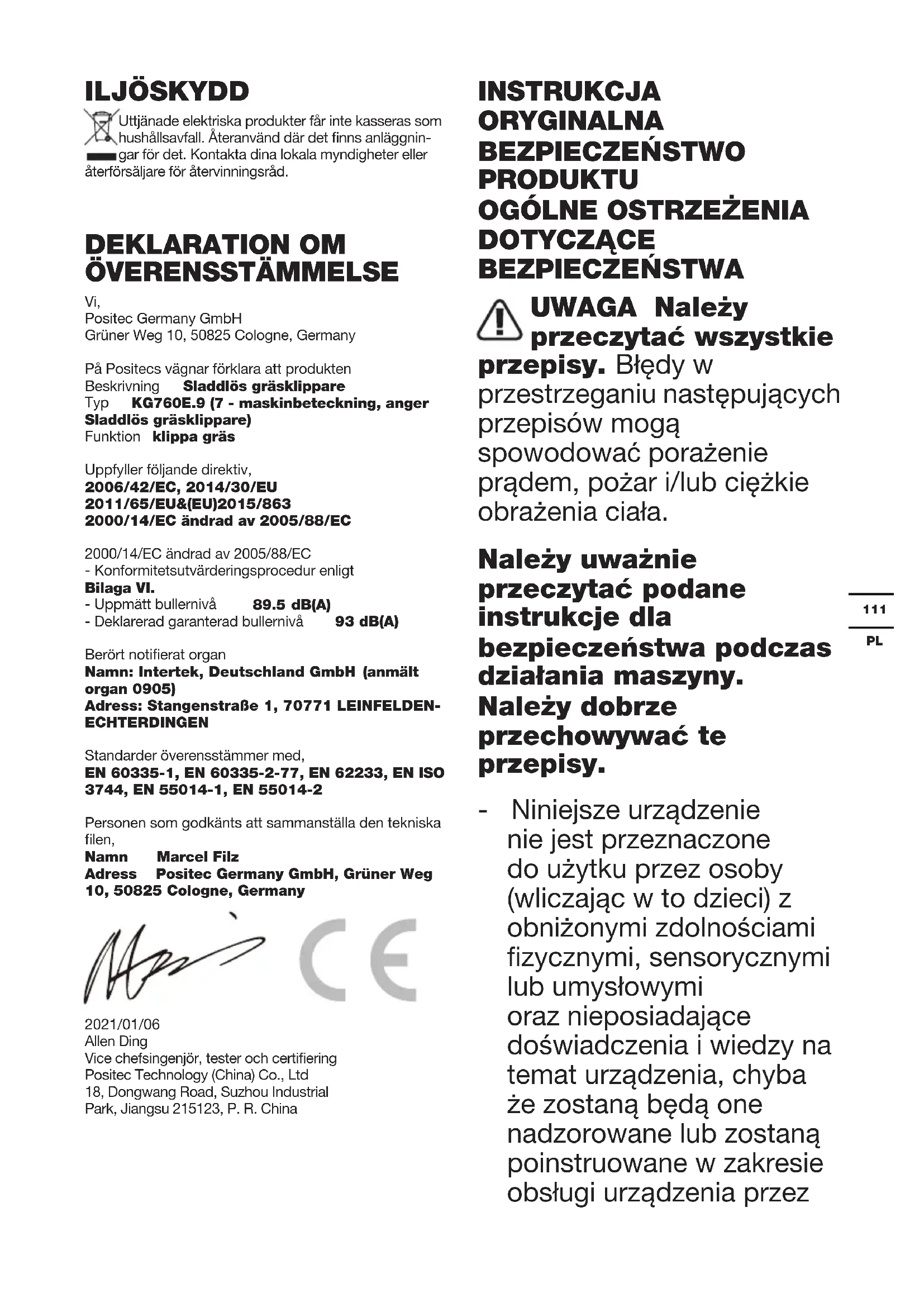 Osoba upoważniona do kompilacji pliku technicznego, Nazwa Marcel Filz Adres Positec Germany GmbH, Grüner Weg 10, 50825 Cologne, Germany 2021/01/06 Allen Ding Zastępca głównego inżyniera, testowanie i certykacja Positec Technology (China) Co., Ltd 18, Dongwang Road, Suzhou Industrial Park, Jiangsu 215123, P. R. China123