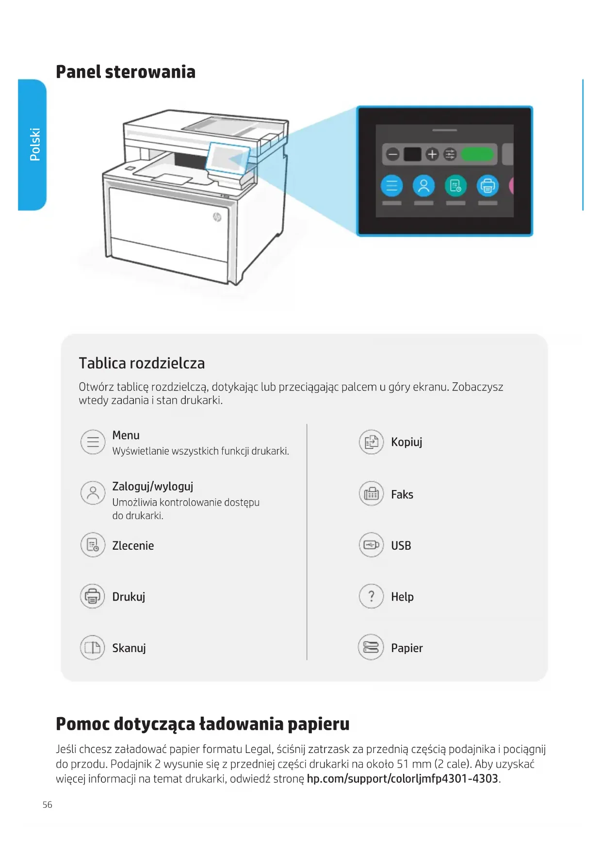 og prøv å koble til igjen. https://www.hp.com/support/ colorljmfp4301-4303 Hjelp og støtte For feilsøking av skriveren og videoer, kan du gå til HPs støtteside. Opplysningene i dette dokumentet kan endres uten forvarsel.56 Panel sterowania Pomoc dotycząca ładowania papieru Jeśli chcesz załadować papier formatu Legal, ściśnij zatrzask za przednią częścią podajnika i pociągnij do przodu. Podajnik 2 wysunie się z przedniej części drukarki na około 51 mm (2 cale). Aby uzyskać więcej informacji na temat drukarki, odwiedź stronę hp.com/support/colorljmfp4301-4303. Tablica rozdzielcza Otwórz tablicę rozdzielczą, dotykając lub przeciągając palcem u góry ekranu. Zobaczysz wtedy zadania i stan drukarki. Menu Wyświetlanie wszystkich funkcji drukarki. Zaloguj/wyloguj Umożliwia kontrolowanie dostępu do drukarki. Zlecenie Drukuj Skanuj Kopiuj Faks USB Help Papier Polski57