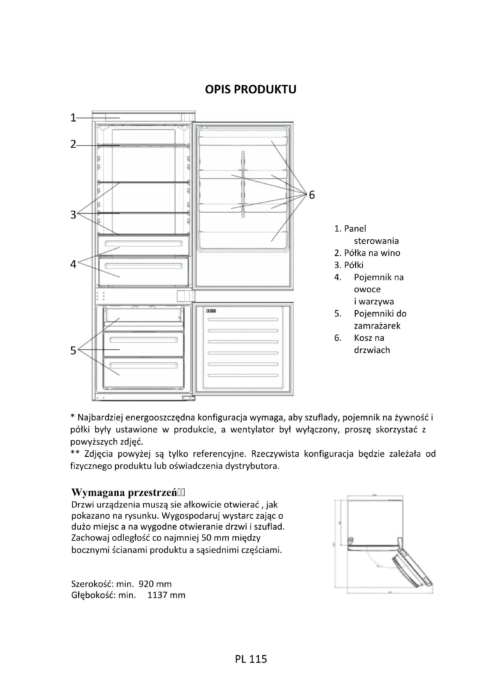 - Najbardziej energooszczędna konfiguracja wymaga, aby szuflady, pojemnik na żywność i półki były ustawione w produkcie, a wentylator był wyłączony, proszę skorzystać z powyższych zdjęć. ** Zdjęcia powyżej są tylko referencyjne. Rzeczywista konfiguracja będzie zależała od fizycznego produktu lub oświadczenia dystrybutora. Wymagana przestrzeń Drzwi urządzenia muszą sie ałkowicie otwierać , jak pokazano na rysunku. Wygospodaruj wystarc zając o dużo miejsc a na wygodne otwieranie drzwi i szuflad. Zachowaj odległość co najmniej 50 mm między bocznymi ścianami produktu a sąsiednimi częściami. Szerokość: min. 920 mm Głębokość: min. 1137 mm