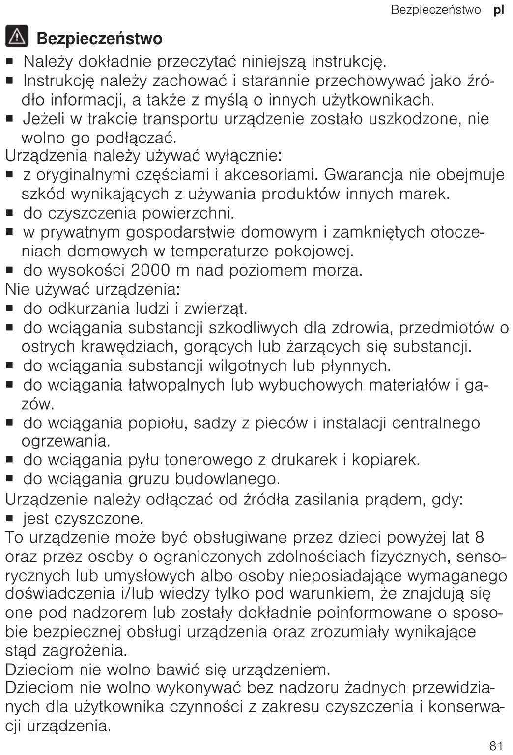 Bezpieczeństwo ¡ Należy dokładnie przeczytać niniejszą instrukcję. ¡ Instrukcję należy zachować i starannie przechowywać jako źró- dło informacji, a także z myślą o innych użytkownikach. ¡ Jeżeli w trakcie transportu urządzenie zostało uszkodzone, nie wolno go podłączać. Urządzenia należy używać wyłącznie: ¡ zoryginalnymi częściami iakcesoriami. Gwarancja nie obejmuje szkód wynikających z używania produktów innych marek. ¡ do czyszczenia powierzchni. ¡ w prywatnym gospodarstwie domowym i zamkniętych otocze- niach domowych w temperaturze pokojowej. ¡ do wysokości 2000m nad poziomem morza. Nie używać urządzenia: ¡ do odkurzania ludzi i zwierząt. ¡ do wciągania substancji szkodliwych dla zdrowia, przedmiotów o ostrych krawędziach, gorących lub żarzących się substancji. ¡ do wciągania substancji wilgotnych lub płynnych. ¡ do wciągania łatwopalnych lub wybuchowych materiałów i ga- zów. ¡ do wciągania popiołu, sadzy z pieców i instalacji centralnego ogrzewania. ¡ do wciągania pyłu tonerowego z drukarek i kopiarek. ¡ do wciągania gruzu budowlanego. Urządzenie należy odłączać od źródła zasilania prądem, gdy: ¡ jest czyszczone. To urządzenie może być obsługiwane przez dzieci powyżej lat 8 oraz przez osoby oograniczonych zdolnościach fizycznych, senso- rycznych lub umysłowych albo osoby nieposiadające wymaganego doświadczenia i/lub wiedzy tylko pod warunkiem, że znajdują się one pod nadzorem lub zostały dokładnie poinformowane o sposo- bie bezpiecznej obsługi urządzenia oraz zrozumiały wynikające stąd zagrożenia. Dzieciom nie wolno bawić się urządzeniem. Dzieciom nie wolno wykonywać bez nadzoru żadnych przewidzia- nych dla użytkownika czynności z zakresu czyszczenia i konserwa- cji urządzenia.pl Bezpieczeństwo