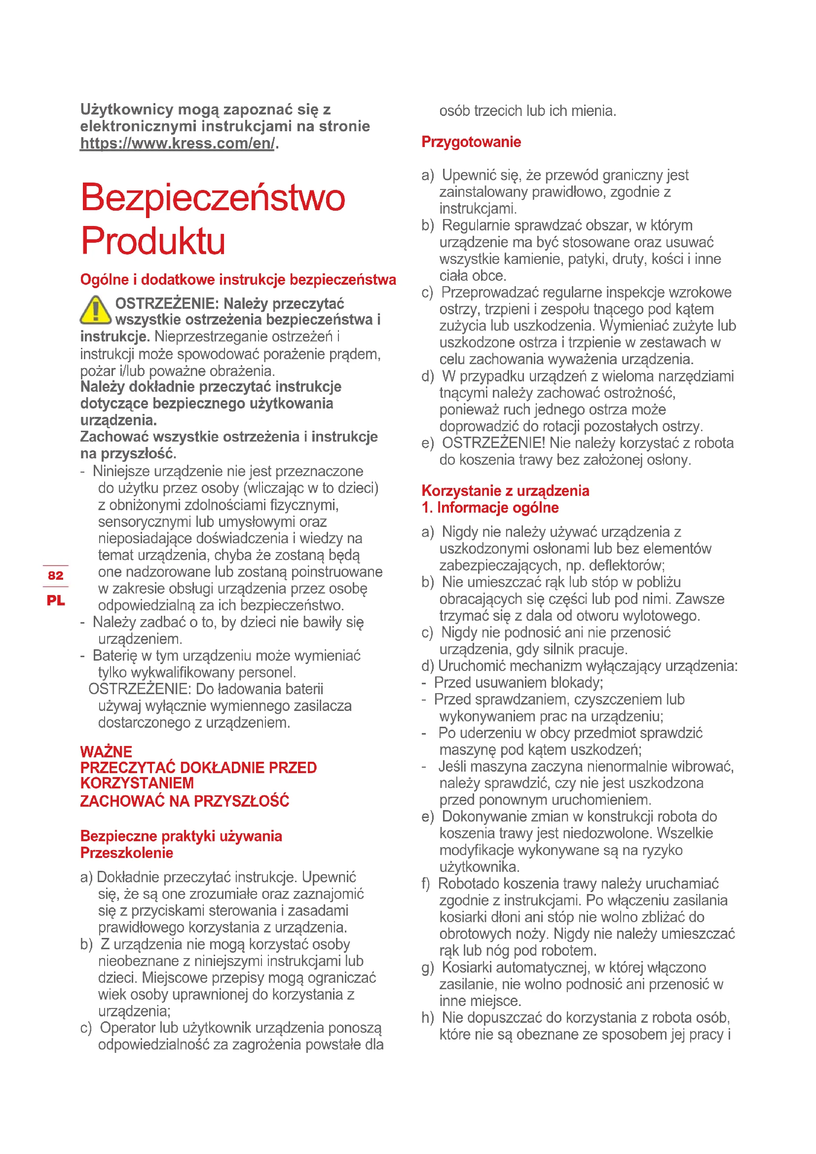 Użytkownicy mogą zapoznać się z elektronicznymi instrukcjami na stronie https://www.kress.com/en/. Bezpieczeństwo Produktu Ogólne i dodatkowe instrukcje bezpieczeństwa OSTRZEŻENIE: Należy przeczytać wszystkie ostrzeżenia bezpieczeństwa i instrukcje. Nieprzestrzeganie ostrzeżeń i instrukcji może spowodować porażenie prądem, pożar i/lub poważne obrażenia. Należy dokładnie przeczytać instrukcje dotyczące bezpiecznego użytkowania urządzenia. Zachować wszystkie ostrzeżenia i instrukcje na przyszłość. - Niniejsze urządzenie nie jest przeznaczone do użytku przez osoby (wliczając w to dzieci) z obniżonymi zdolnościami zycznymi, sensorycznymi lub umysłowymi oraz nieposiadające doświadczenia i wiedzy na temat urządzenia, chyba że zostaną będą one nadzorowane lub zostaną poinstruowane w zakresie obsługi urządzenia przez osobę odpowiedzialną za ich bezpieczeństwo. - Należy zadbać o to, by dzieci nie bawiły się urządzeniem. - Baterię w tym urządzeniu może wymieniać tylko wykwalikowany personel. OSTRZEŻENIE: Do ładowania baterii używaj wyłącznie wymiennego zasilacza dostarczonego z urządzeniem. WAŻNE