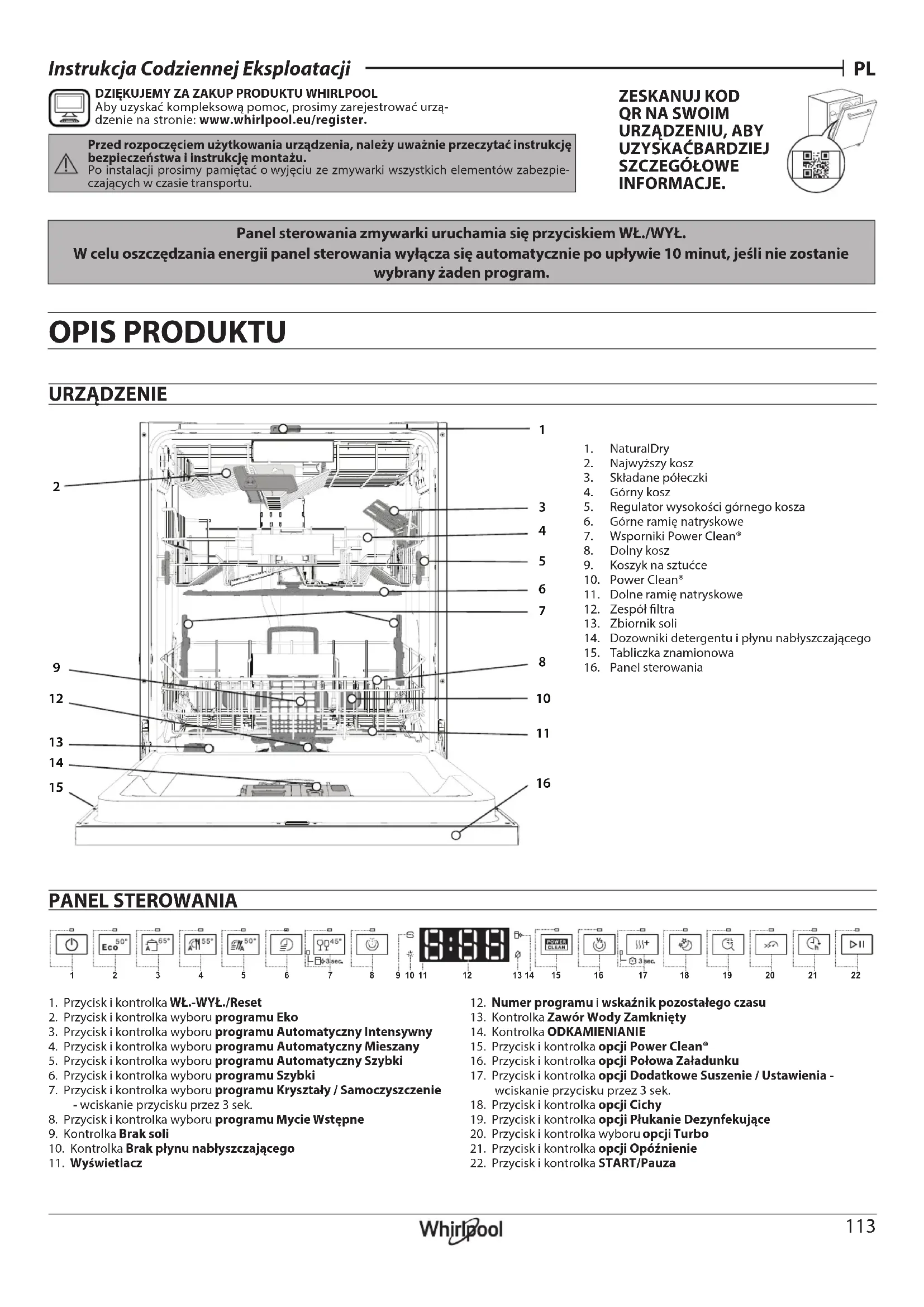 DZIĘKUJEMY ZA ZAKUP PRODUKTU WHIRLPOOL Aby uzyskać kompleksową pomoc, prosimy zarejestrować urzą-dzenie na stronie: www.whirlpool.eu/register.Przed rozpoczęciem użytkowania urządzenia, należy uważnie przeczytać instrukcję bezpieczeństwa iinstrukcję montażu.Po instalacji prosimy pamiętać owyjęciu ze zmywarki wszystkich elementów zabezpie-czających wczasie transportu. ZESKANUJ KOD