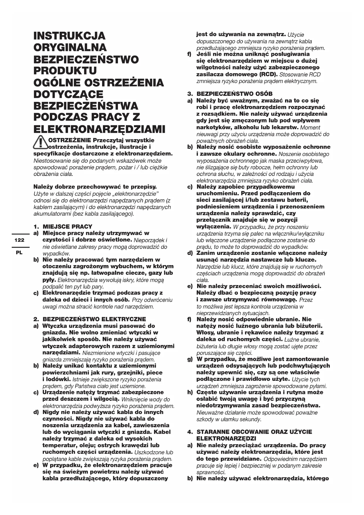 ELEKTRONARZĘDZIAMI OSTRZEŻENIE Przeczytaj wszystkie ostrzeżenia, instrukcje, ilustracje i specyfikacje dostarczone z elektronarzędziem. Niestosowanie się do podanych wskazówek może spowodować porażenie prądem, pożar i / lub ciężkie obrażenia ciała. Należy dobrze przechowywać te przepisy. Użyte w dalszej części pojęcie „elektronarzędzie” odnosi się do elektronarzędzi napędzanych prądem (z kablem zasilającym) i do elektronarzędzi napędzanych akumulatorami (bez kabla zasilającego).
