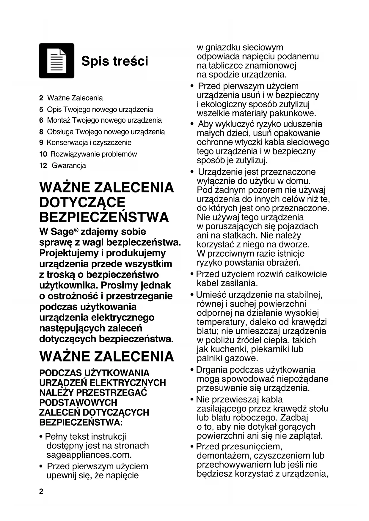 - Pełny tekst instrukcji dostępny jest na stronach sageappliances.com.