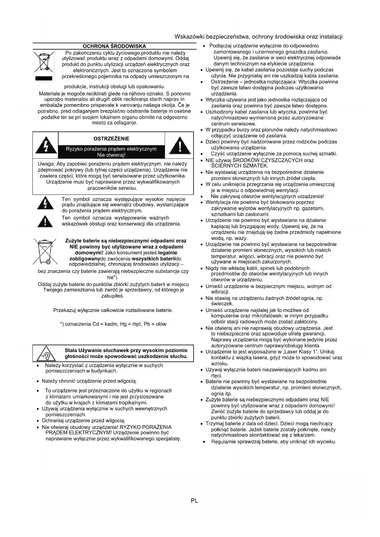 bez znaczenia czy baterie zawierają niebezpieczne substancje czy nie*). Oddaj zużyte baterie do punktów zbiórki zużytych baterii w miejscu Twojego zamieszkania lub zwróć je sprzedawcy, od którego je zakupiłeś. Przekazuj wyłącznie całkowicie rozładowane baterie. *) oznaczenia Cd = kadm, Hg = rtęć, Pb = ołów