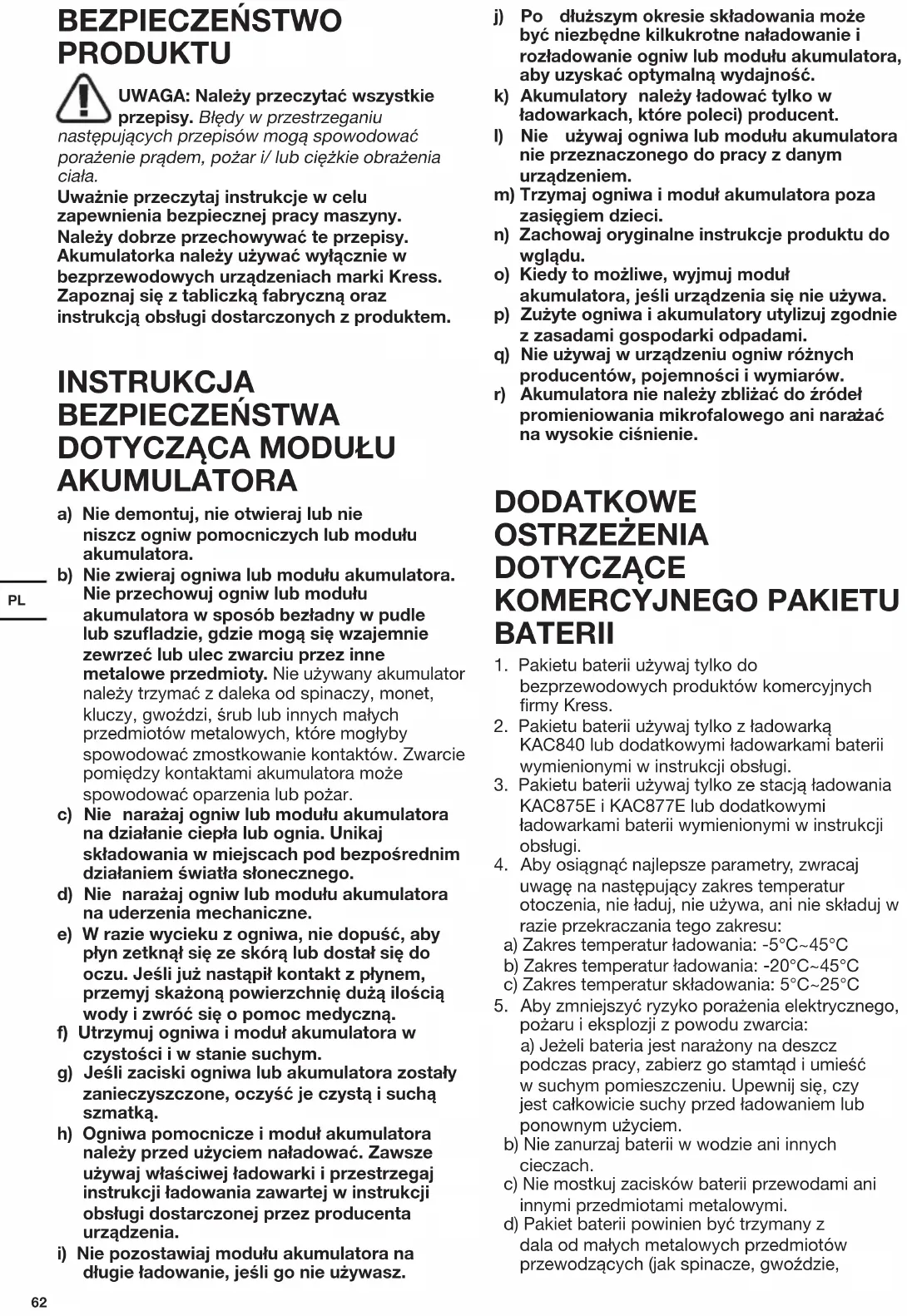 BEZPIECZEēSTWO PRODUKTU UWAGA: NaleĪy przeczytaü wszystkie przepisy. BłĊdy w przestrzeganiu nastĊpujących przepisów mogą spowodowaü poraĪenie prądem, poĪar i/ lub ciĊĪkie obraĪenia ciała. UwaĪnie przeczytaj instrukcje w celu zapewnienia bezpiecznej pracy maszyny. NaleĪy dobrze przechowywaü te przepisy. Akumulatorka naleĪy uĪywaü wyłącznie w bezprzewodowych urządzeniach marki Kress. Zapoznaj siĊ z tabliczką fabryczną oraz instrukcją obsługi dostarczonych z produktem. INSTRUKCJA BEZPIECZEēSTWA
