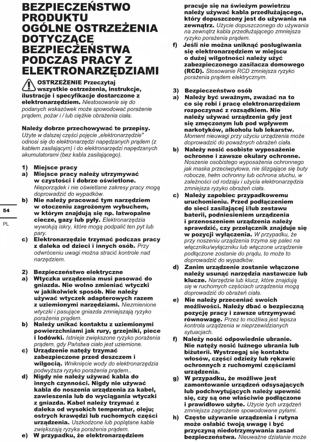 a) Należy być uważnym, zważać na to co się robi i pracę elektronarzędziem rozpoczynać z rozsądkiem. Nie należy używać urządzenia gdy jest się zmęczonym lub pod wpływem narkotyków, alkoholu lub lekarstw. Moment nieuwagi przy użyciu urządzenia może doprowadzić do poważnych obrażeń ciała. b) Należy nosić osobiste wyposażenie ochronne i zawsze okulary ochronne. Noszenie osobistego wyposażenia ochronnego jak maska przeciwpyłowa, nie ślizgające się buty robocze, hełm ochronny lub ochrona słuchu, w zależności od rodzaju i użycia elektronarzędzia zmniejsza ryzyko obrażeń ciała. c) Należy zapobiec przypadkowemu uruchomieniu. Przed podłączeniem do sieci zasilającej i/lub zestawu baterii, podniesieniem urządzenia i przenoszeniem urządzenia należy sprawdzić, czy przełącznik znajduje się w pozycji wyłączenia. W przypadku, że przy noszeniu urządzenia trzyma się palec na włączniku/wyłączniku lub włączone urządzenie podłączone zostanie do prądu, to może to doprowadzić do wypadków. d) Zanim urządzenie zostanie włączone należy usunąć narzędzia nastawcze lub klucze. Narzędzie lub klucz, które znajdują się w ruchomych częściach urządzenia mogą doprowadzić do obrażeń ciała. e) Nie należy przeceniać swoich możliwości. Należy dbać o bezpieczną pozycję pracy i zawsze utrzymywać równowagę. Przez to możliwa jest lepsza kontrola urządzenia w nieprzewidzianych sytuacjach. f) Należy nosić odpowiednie ubranie. Nie natęży nosić luźnego ubrania lub biżuterii. Wystrzegaj się kontaktu włosów, części odzieży lub rękawic ochronnych z ruchomymi częściami urządzenia. g) W przypadku, że możliwe jest zamontowanie urządzeń odsysających lub podchwytujących należy upewnić się, czy są one właściwie podłączone i prawidłowo użyte. Użycie tych urządzeń zmniejsza zagrożenie spowodowane pyłami. h) Częste używanie urządzenia i rutyna może osłabić twoją uwagę i być przyczyną niedotrzymywania zasad bezpieczeństwa. Nieuważne działanie może55