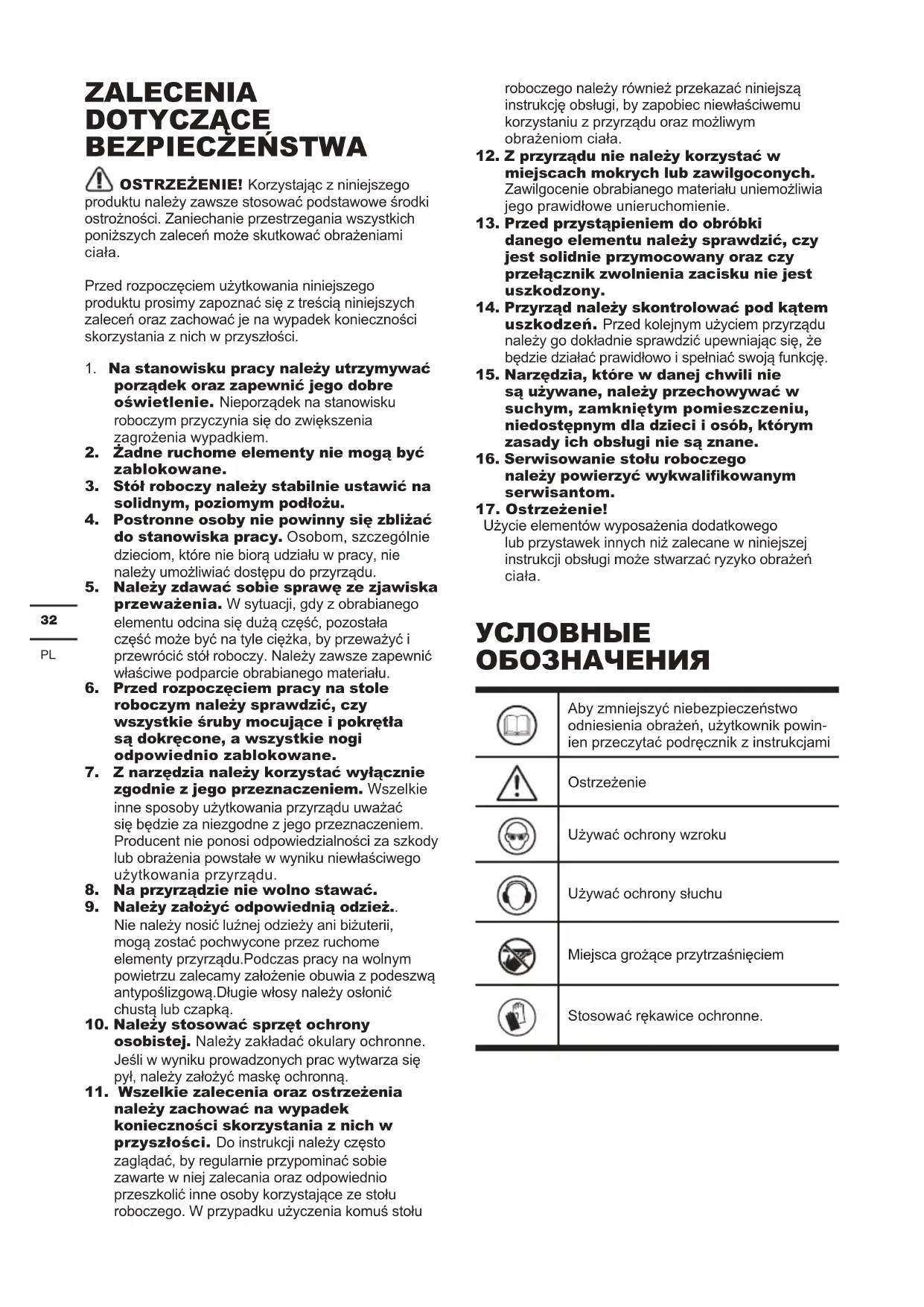 należy zachować na wypadek konieczności skorzystania z nich w przyszłości. Do instrukcji należy często zaglądać, by regularnie przypominać sobie zawarte w niej zalecania oraz odpowiednio przeszkolić inne osoby korzystające ze stołu roboczego. W przypadku użyczenia komuś stołu roboczego należy również przekazać niniejszą instrukcję obsługi, by zapobiec niewłaściwemu korzystaniu z przyrządu oraz możliwym obrażeniom ciała.