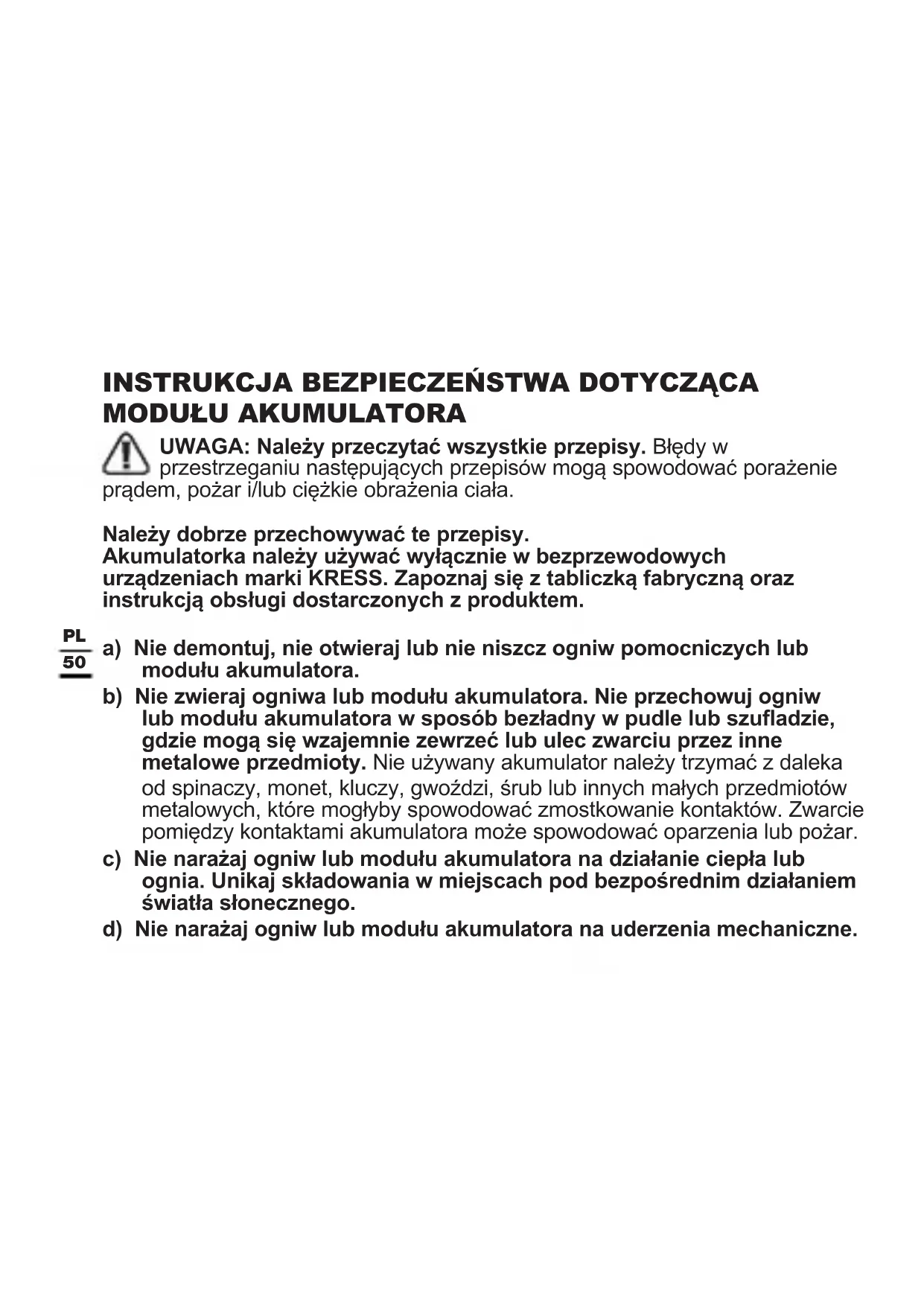 UWAGA: Należy przeczytać wszystkie przepisy. Błędy w przestrzeganiu następujących przepisów mogą spowodować porażenie prądem, pożar i/lub ciężkie obrażenia ciała. Należy dobrze przechowywać te przepisy. Akumulatorka należy używać wyłącznie w bezprzewodowych urządzeniach marki KRESS. Zapoznaj się z tabliczką fabryczną oraz instrukcją obsługi dostarczonych z produktem. a) Nie demontuj, nie otwieraj lub nie niszcz ogniw pomocniczych lub modułu akumulatora. b) Nie zwieraj ogniwa lub modułu akumulatora. Nie przechowuj ogniw lub modułu akumulatora w sposób bezładny w pudle lub szuadzie, gdzie mogą się wzajemnie zewrzeć lub ulec zwarciu przez inne metalowe przedmioty. Nie używany akumulator należy trzymać z daleka od spinaczy, monet, kluczy, gwoździ, śrub lub innych małych przedmiotów metalowych, które mogłyby spowodować zmostkowanie kontaktów. Zwarcie pomiędzy kontaktami akumulatora może spowodować oparzenia lub pożar. c) Nie narażaj ogniw lub modułu akumulatora na działanie ciepła lub ognia. Unikaj składowania w miejscach pod bezpośrednim działaniem światła słonecznego. d) Nie narażaj ogniw lub modułu akumulatora na uderzenia mechaniczne.51