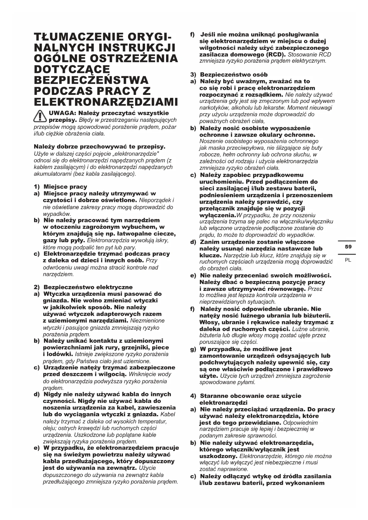 ELEKTRONARZĘDZIAMI UWAGA: Należy przeczytać wszystkie przepisy. Błędy w przestrzeganiu następujących przepisów mogą spowodować porażenie prądem, pożar i/lub ciężkie obrażenia ciała. Należy dobrze przechowywać te przepisy. Użyte w dalszej części pojęcie „elektronarzędzie" odnosi się do elektronarzędzi napędzanych prądem (z kablem zasilającym) i do elektronarzędzi napędzanych akumulatorami (bez kabla zasilającego).