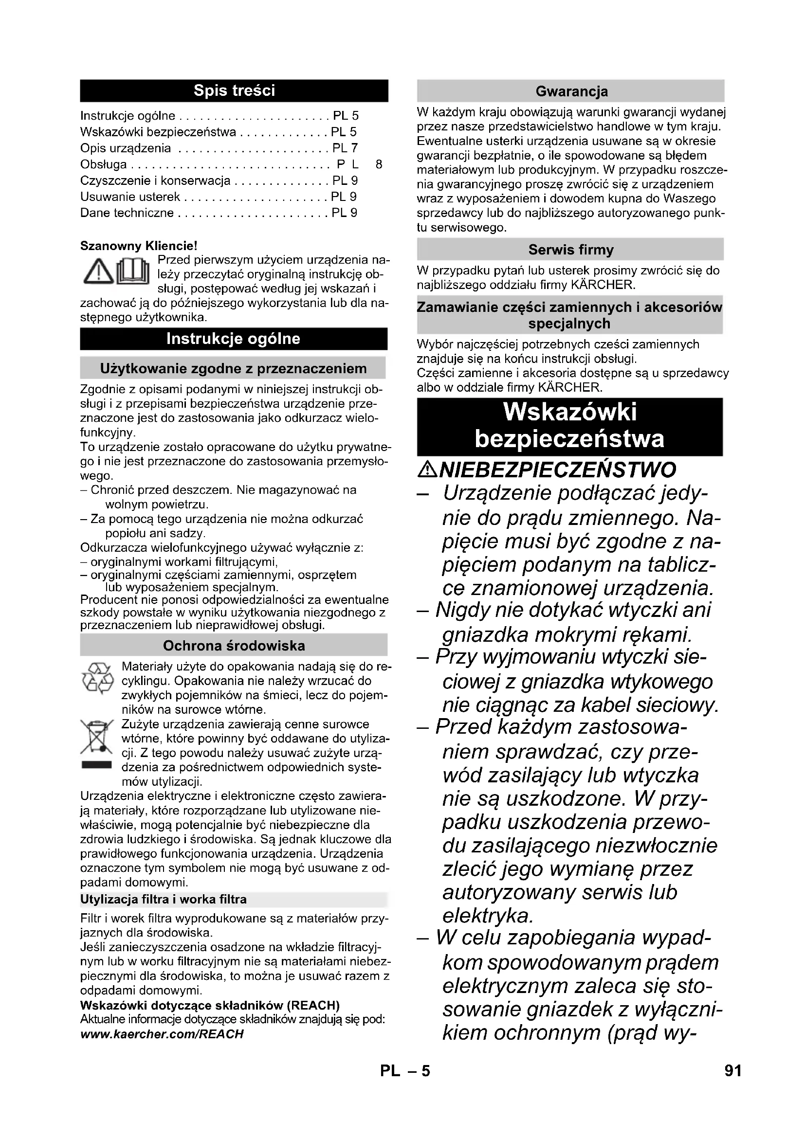 UWAGA Wskazówka dot. możliwie nie- bezpiecznej sytuacji, która może prowadzić do szkód mate- rialnych. Ilustracje, patrz strony rozkładane! Niniejsza instrukcja obsługi opisuje odku- rzacz wielofunkcyjny przedstawiony na stronie tytułowej. Podczas rozpakowywania urządzenia należy spraw- dzić, czy w opakowaniu znajdują się wszystkie elemen- ty i czy nic nie jest uszkodzone. W przypadku stwierdze- nia uszkodzeń w transporcie należy zwrócić się do dys- trybutora. Rysunek Do podłączenia wężyka do zasysania. Rysunek Położenie I: Tryb normalny, odkurzanie lub na- dmuch. Położenie 0: Sprzęt jest wyłączony. Do noszenia urządzenia wzgl. do zdjęcia głowicy urządzenia po odryglowaniu. Rysunek Do przechowywania przewodu sieciowego. Rysunek Włożyć wężyk do zasysania do złącza nadmuchu; powoduje to aktywację funkcji wydmuchiwania. Rysunek W celu otwarcia, pociągnąć na zewnątrz, w celu zaryglowania, docisnąć do wewnątrz. Rysunek Do odstawiania dyszy do podłóg podczas krótkich przerw w pracy. Rysunek Schowek na akcesoria umożliwia przechowywanie rur i dysz ssących przy urządzeniu. Rysunek Kółka skrętne są umieszczone przy dostawie w zbiorniku; przed uruchomieniem należy je zamon- tować. Stopnie zagrożenia Opis urządzenia Przyłącze węża ssącego Włącznik/ wyłącznik Uchwyt do noszenia Hak kablowy Złącze nadmuchu Klamra pojemnika Pozycja parkowania Schowek na akcesoria Kółko skrętne 93PL– 8 Wskazówka: Do odkurzania na mokro nie można uży- wać worka filtracyjnego! Rysunek Zalecenie: Worek filtracyjny używany jest do odku- rzania drobnego pyłu. Rysunek Nabój filtracyjny musi być używany zawsze, zarów- no przy odkurzaniu na mokro jak i na sucho. Wskazówka: Przed ponownym użyciem mokrego na- boju filtracyjnego do odkurzania na sucho, należy go wysuszyć. Rysunek Wsunąć wężyk do zasysania do urządzenia, aż do jego zazębienia. W celu jego wyjęcia nacisnąć zatrzask kciukiem i wyjąć wężyk do zasysania. Wskazówka: Akcesoria, np. szczotki ssawne, można nałożyć bezpośrednio na element łączący i tym samym połączyć z wężykiem do zasysania. Do wygodnej pracy również na wąskiej przestrzeni. Patrz pozycja 13. Zdejmowaną rękojeść można w razie potrzeby umieścić pomiędzy akcesoriami a wężykiem do zasysania. Zalecenie: Do odkurzania podłogi nałożyć rękojeść na wężyk do zasysania. Rysunek Połączyć rękojeść z wężykiem do zasysania, aż zaskoczy. Rysunek W celu zdjęcia rękojeści z wężyka do zasysania, nacisnąć zatrzask kciukiem i zdjąć rękojeść. Wskazówka: Po zdjęciu rękojeści akcesoria można na- łożyć również bezpośrednio na wężyk do zasysania. Zalecenie: Do odkurzania podłogi nałożyć rękojeść na wężyk do zasysania. Patrz pozycja 12. Rysunek Złożyć ze sobą obydwie rury ssące i połączyć je z rękojeścią. Do czyszczenia trudno dostępnych obszarów, jak np. pomiędzy fotelami w samochodzie. Rysunek Wskazówka: Do odkurzania podłogi z suchymi za- nieczyszczeniami lub przy użyciu wody - zawsze używać dyszy podłogowej (lista szczotkowa i ścią- gacz). Do łatwego i szybkiego czyszczenia pojazdu - od obszaru nóg w samochodzie aż po bagażnik. Do gruntownego czyszczenia tapicerki i powierzch- ni dywanowych w samochodzie. Zasuszony brud można w łatwy sposób usunąć dzięki stabilnej szczecinie. Do delikatnego czyszczenia wrażliwych powierzch- ni w samochodzie, jak np. deski rozdzielczej lub konsoli środkowej. UWAGA Pracować zawsze z założonym wkładem filtracyjnym, zarówno podczas odkurzania na mokro, jak i na sucho! Rysunek Przed uruchomieniem zamontować luźno dołączo- ne części do urządzenia. Rysunek Podłączyć akcesoria. Rysunek Podłączyć urządzenie do zasilania. Rysunek Włączyć urządzenie. UWAGA Przed zastosowaniem filtra, sprawdzić go pod kątem uszkodzeń, a w razie potrzeby wymienić. Pracować tylko przy użyciu suchego wk ładu filtracyjne- go! Rysunek Zalecenie: Worek filtracyjny używany jest do odku- rzania drobnego pyłu. – Stopień napełnienia worka filtracyjnego zależy od rodzaju zasysanych śmieci. – W przypadku drobnego pyłu, piasku itp., worek fil- tracyjny należy zmieniać częściej. – Założone worki filtra mogą pęknąć, z tego względu należy na czas wymienić worek filtra! Worek filtracyjny Nabój filtrujący Wężyk do zasysania z elementem łączącym Zdejmowana rękojeść Rury ssące 2 x 0,5 m Dysza szczelinowa, 350 mm Ssawka podłogowa Dysza ssąca Szczotka ssąca z twardą szczeciną, biała Szczotka ssąca z miękką szczeciną, czarna Obsługa Przed uruchomieniem Uruchomienie Odkurzanie na sucho Wskazówki dot. worka filtracyjnego 94 PL– 9 UWAGA Odkurzanie zimnego popiołu tylko przy użyciu separa- tora wstępnego. Nr katalogowy Wersja Basic: 2.863-139.0, Wersja Pre- mium: 2.863-161.0. UWAGA Nie używać worka filtrującego! Do zasysania wody wzgl. wilgoci zwrócić uwagę na właściwą wkładkę dyszy podłogowej i podłączyć odpowiednie akcesoria. Wskazówka: Gdy zbiornik jest pełen, pływak zamyka otwór ssawny, a turbina ssawna pracuje na zwiększo- nych obrotach. Natychmiast wyłączyć urządzenie i opróżnić zbiornik. Czyszczenie ciężko dostępnych miejsc wzgl. miejsc, w których odkurzanie jest niemożliwe, np. listowie w war- stwie żwiru. Rysunek Włożyć wężyk do zasysania do złącza nadmuchu; powoduje to aktywację funkcji wydmuchiwania. Wyłączyć urządzenie. Rysunek Zawiesić dyszę podłogową w pozycji parkowania. Wyłączyć urządzenie i wyjąć wtyczkę z gniazdka sieciowego. Rysunek Zdjąć głowicę urządzenia i opróżnić zbiornik. Rysunek Umieścić przewód sieciowy i wyposażenie przy urządzeniu. Przechowywać urządzenie w suchym pomieszczeniu. Urządzenie i akcesoria z tworzywa sztucznego na- leży czyścić zwykłym środkiem do czyszczenia tworzyw sztucznych. W razie potrzeby wypłukać zbiornik i akcesoria wodą i o