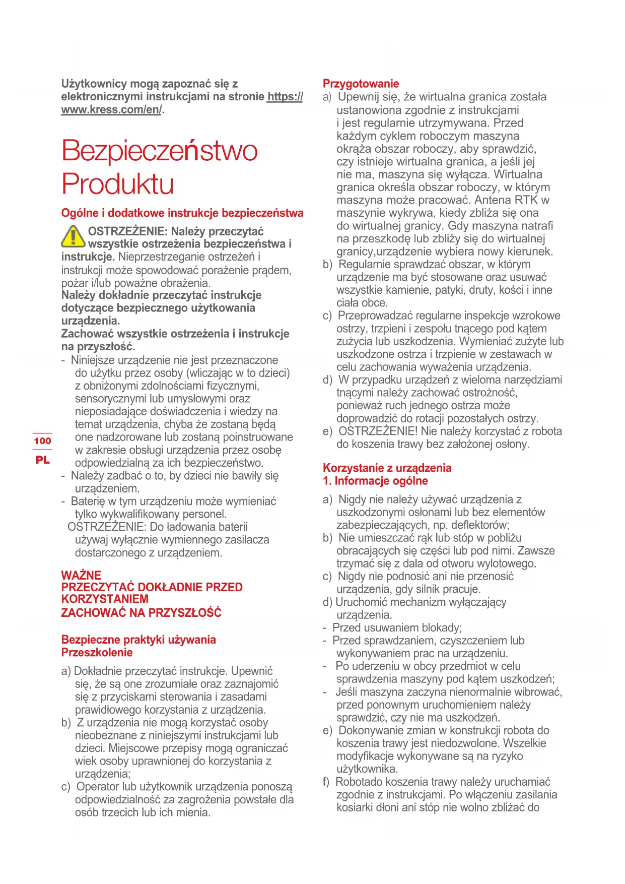 Użytkownicy mogą zapoznać się z elektronicznymi instrukcjami na stronie https:// www.kress.com/en/. Bezpieczeństwo Produktu Ogólne i dodatkowe instrukcje bezpieczeństwa OSTRZEŻENIE: Należy przeczytać wszystkie ostrzeżenia bezpieczeństwa i instrukcje. Nieprzestrzeganie ostrzeżeń i instrukcji może spowodować porażenie prądem, pożar i/lub poważne obrażenia. Należy dokładnie przeczytać instrukcje dotyczące bezpiecznego użytkowania urządzenia. Zachować wszystkie ostrzeżenia i instrukcje na przyszłość. - Niniejsze urządzenie nie jest przeznaczone do użytku przez osoby (wliczając w to dzieci) z obniżonymi zdolnościami zycznymi, sensorycznymi lub umysłowymi oraz nieposiadające doświadczenia i wiedzy na temat urządzenia, chyba że zostaną będą one nadzorowane lub zostaną poinstruowane w zakresie obsługi urządzenia przez osobę odpowiedzialną za ich bezpieczeństwo. - Należy zadbać o to, by dzieci nie bawiły się urządzeniem. - Baterię w tym urządzeniu może wymieniać tylko wykwalikowany personel. OSTRZEŻENIE: Do ładowania baterii używaj wyłącznie wymiennego zasilacza dostarczonego z urządzeniem. WAŻNE