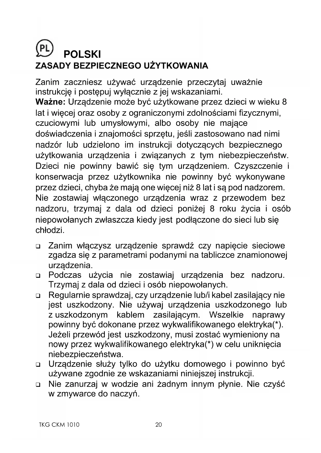 Zanim zaczniesz używać urządzenie przeczytaj uważnie instrukcję i postępuj wyłącznie z jej wskazaniami. Ważne: Urządzenie może być użytkowane przez dzieci w wieku 8 lat i więcej oraz osoby z ograniczonymi zdolnościami fizycznymi, czuciowymi lub umysłowymi, albo osoby nie mające doświadczenia i znajomości sprzętu, jeśli zastosowano nad nimi nadzór lub udzielono im instrukcji dotyczących bezpiecznego użytkowania urządzenia i związanych z tym niebezpieczeństw. Dzieci nie powinny bawić się tym urządzeniem. Czyszczenie i konserwacja przez użytkownika nie powinny być wykonywane przez dzieci, chyba że mają one więcej niż 8 lat i są pod nadzorem. Nie zostawiaj włączonego urządzenia wraz z przewodem bez nadzoru, trzymaj z dala od dzieci poniżej 8 roku życia i osób niepowołanych zwłaszcza kiedy jest podłączone do sieci lub się chłodzi. ❑ Zanim włączysz urządzenie sprawdź czy napięcie sieciowe zgadza się z parametrami podanymi na tabliczce znamionowej urządzenia. ❑ Podczas użycia nie zostawiaj urządzenia bez nadzoru. Trzymaj z dala od dzieci i osób niepowołanych. ❑ Regularnie sprawdzaj, czy urządzenie lub/i kabel zasilający nie jest uszkodzony. Nie używaj urządzenia uszkodzonego lub z uszkodzonym kablem zasilającym. Wszelkie naprawy powinny być dokonane przez wykwalifikowanego elektryka(*). Jeżeli przewód jest uszkodzony, musi zostać wymieniony na nowy przez wykwalifikowanego elektryka(*) w celu uniknięcia niebezpieczeństwa. ❑ Urządzenie służy tylko do użytku domowego i powinno być używane zgodnie ze wskazaniami niniejszej instrukcji. ❑ Nie zanurzaj w wodzie ani żadnym innym płynie. Nie czyść w zmywarce do naczyń.21 TKG CKM 1010