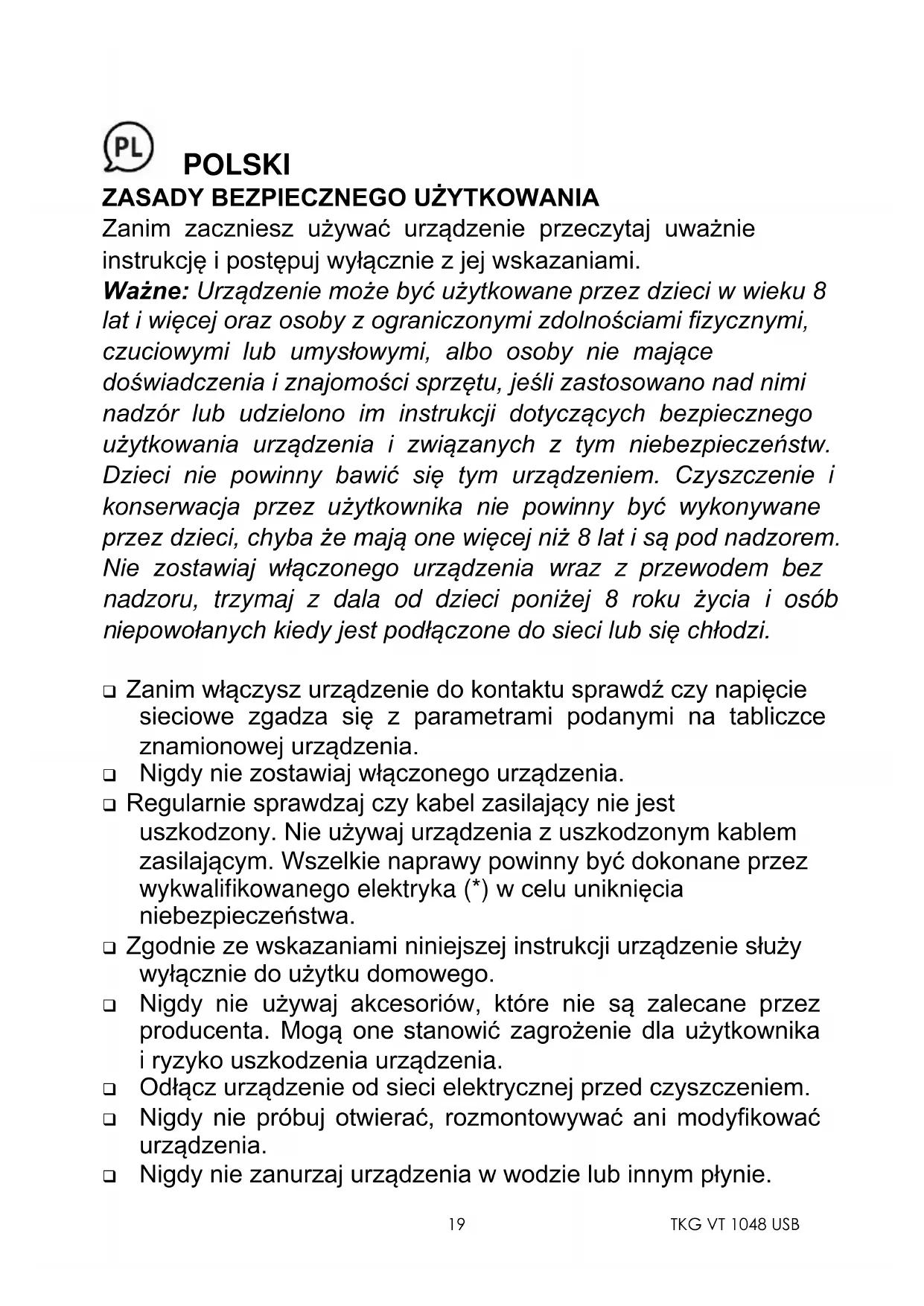 Zanim zaczniesz używać urządzenie przeczytaj uważnie instrukcję i postępuj wyłącznie z jej wskazaniami. Ważne: Urządzenie może być użytkowane przez dzieci w wieku 8 lat i więcej oraz osoby z ograniczonymi zdolnościami fizycznymi, czuciowymi lub umysłowymi, albo osoby nie mające doświadczenia i znajomości sprzętu, jeśli zastosowano nad nimi nadzór lub udzielono im instrukcji dotyczących bezpiecznego użytkowania urządzenia i związanych z tym niebezpieczeństw. Dzieci nie powinny bawić się tym urządzeniem. Czyszczenie i konserwacja przez użytkownika nie powinny być wykonywane przez dzieci, chyba że mają one więcej niż 8 lat i są pod nadzorem. Nie zostawiaj włączonego urządzenia wraz z przewodem bez nadzoru, trzymaj z dala od dzieci poniżej 8 roku życia i osób niepowołanych kiedy jest podłączone do sieci lub się chłodzi. ❑ Zanim włączysz urządzenie do kontaktu sprawdź czy napięcie sieciowe zgadza się z parametrami podanymi na tabliczce znamionowej urządzenia. ❑ Nigdy nie zostawiaj włączonego urządzenia. ❑ Regularnie sprawdzaj czy kabel zasilający nie jest uszkodzony. Nie używaj urządzenia z uszkodzonym kablem zasilającym. Wszelkie naprawy powinny być dokonane przez wykwalifikowanego elektryka (*) w celu uniknięcia niebezpieczeństwa. ❑ Zgodnie ze wskazaniami niniejszej instrukcji urządzenie służy wyłącznie do użytku domowego. ❑ Nigdy nie używaj akcesoriów, które nie są zalecane przez producenta. Mogą one stanowić zagrożenie dla użytkownika i ryzyko uszkodzenia urządzenia. ❑ Odłącz urządzenie od sieci elektrycznej przed czyszczeniem. ❑ Nigdy nie próbuj otwierać, rozmontowywać ani modyfikować urządzenia. ❑ Nigdy nie zanurzaj urządzenia w wodzie lub innym płynie.TKG VT 1048 USB